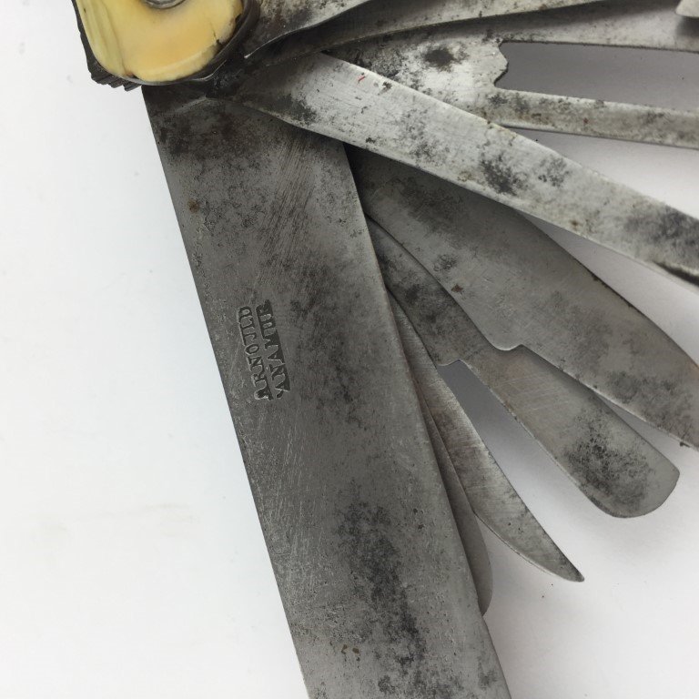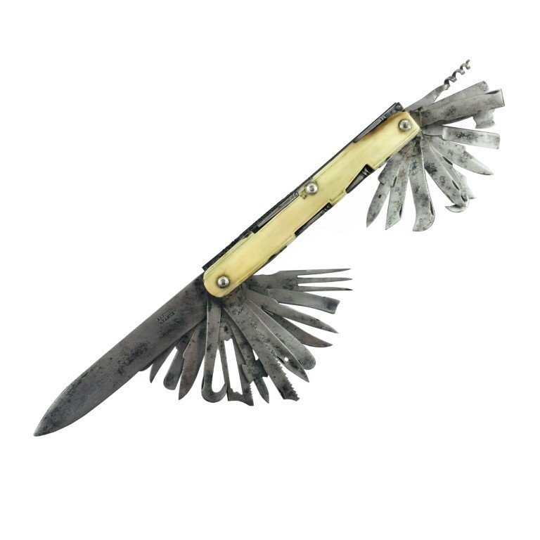 Navaja belga c. 1900. Multifunción, con treintaisiete accesorios. Cachas en marfil. Hoja marcada por el fabricante «Arnould A Namur». Largo máximo abierto 32.5 cm. Largo cerrado 15 cm.
