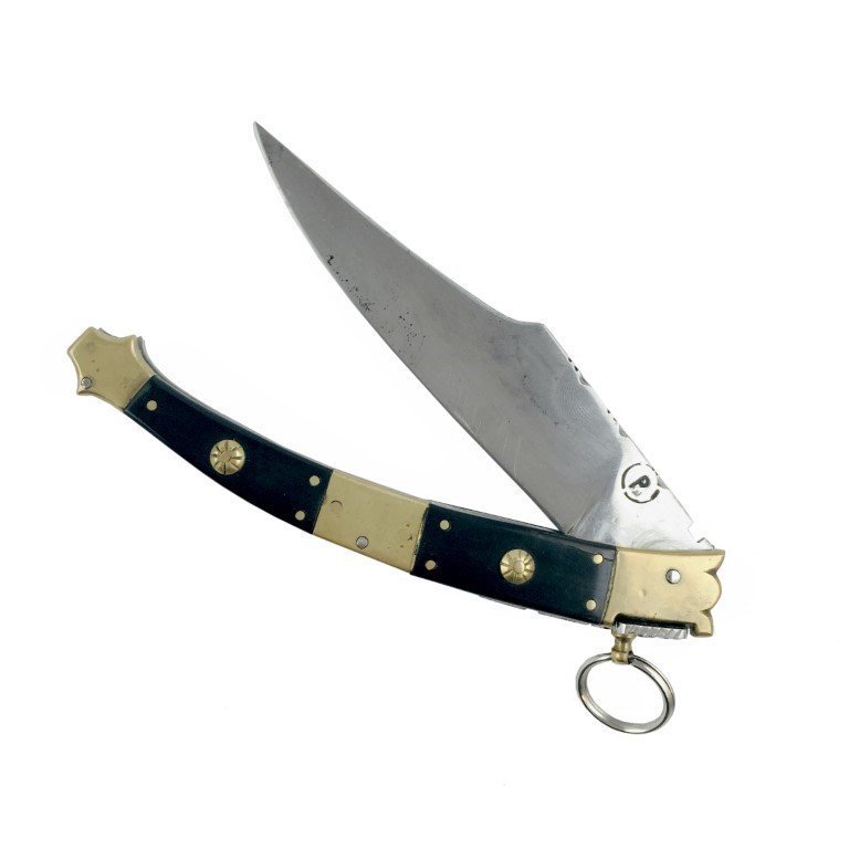 Navaja española. Cachas en bronce y guampa de búfalo. Seguro de argolla. Fabricada por Pedro Manuel Rodríguez, Azuqueca. Largo abierto 29 cm.