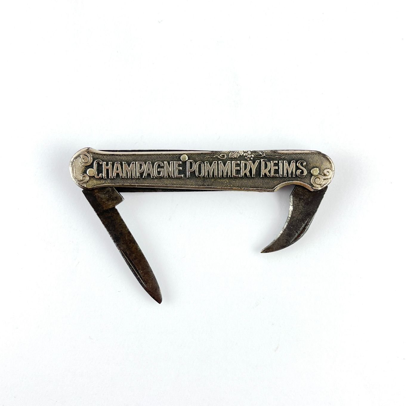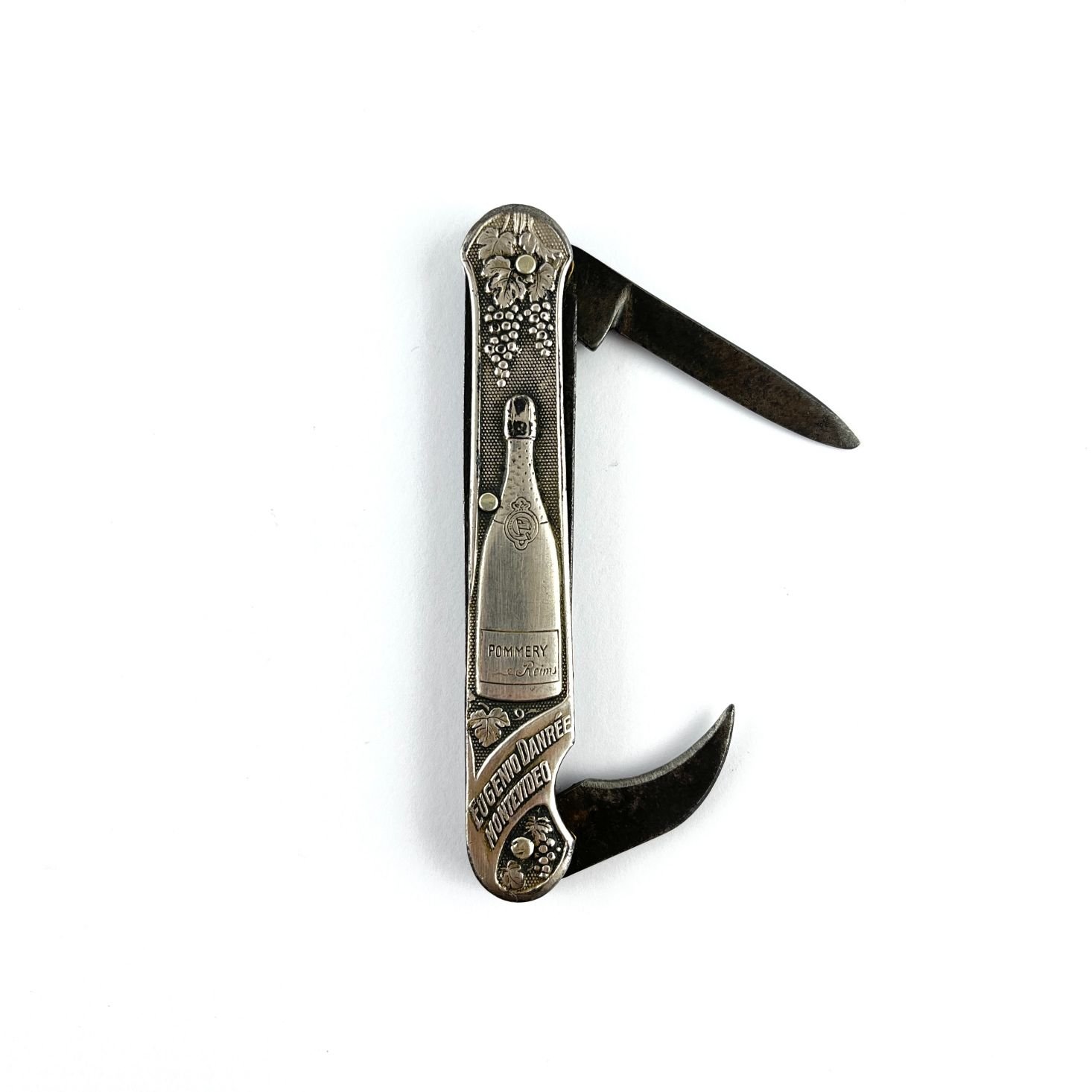 Navaja francesa publicitaria del champagne Pommery, Reims. Tres accesorios. Cachas en metal estampado con publicidad del importador Eugenio Danrée. Largo cerrado 9 cm.