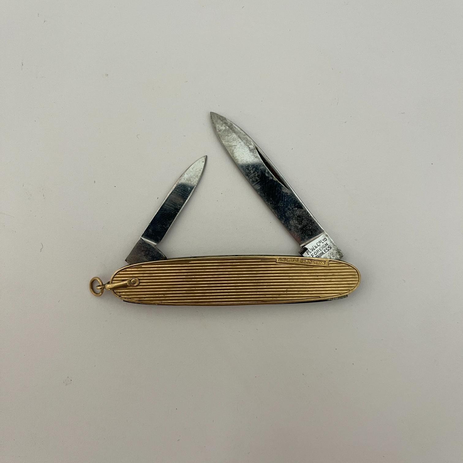 Navaja inglesa de dos hojas, con cachas en oro amarillo 9 K. Largo cerrado 7 cm.