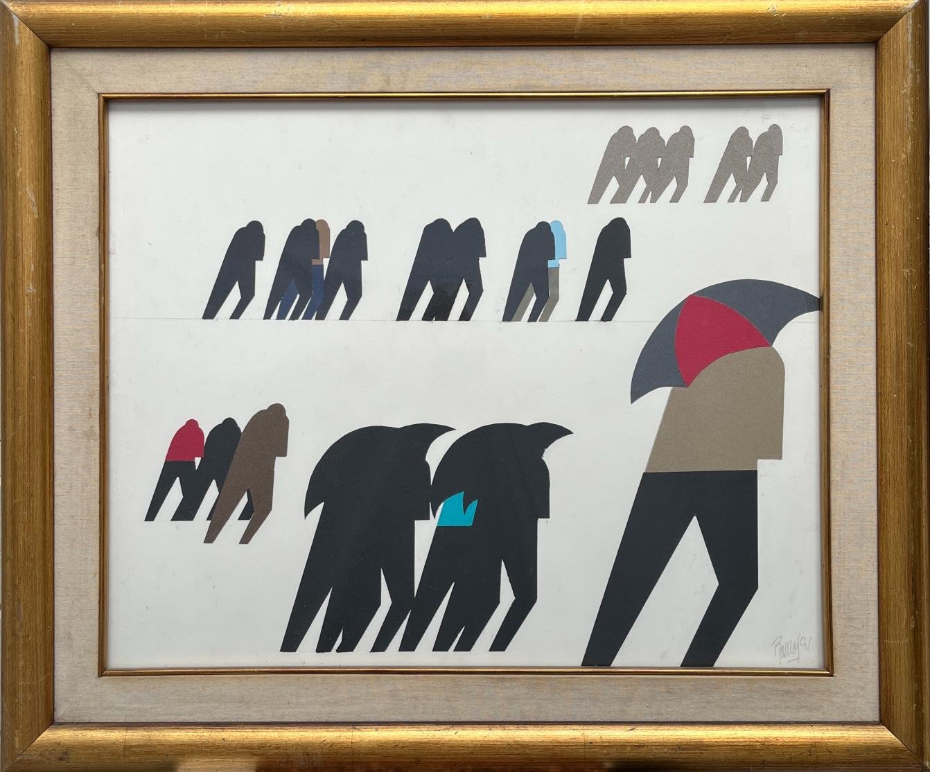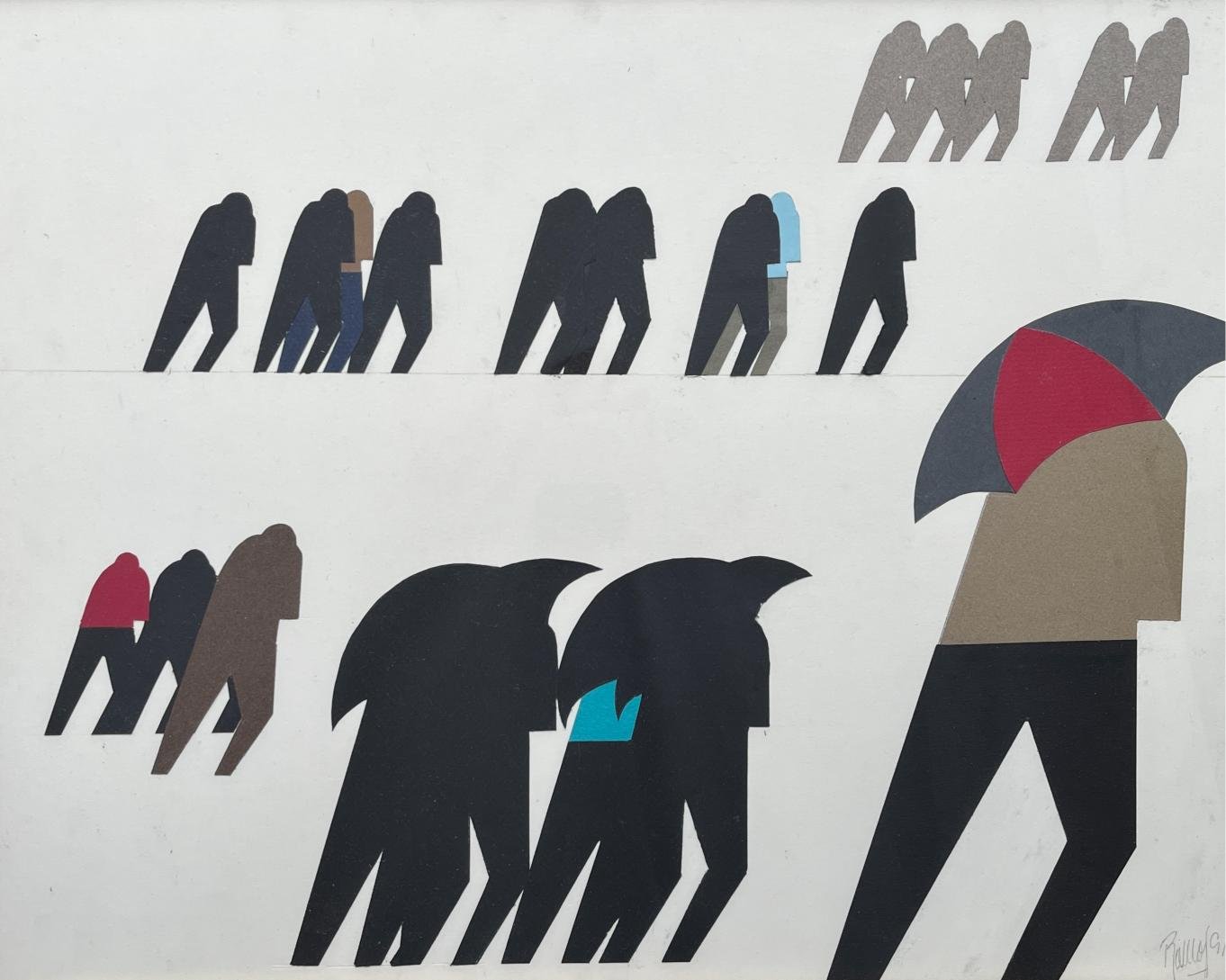 NELSON RAMOS (Escuela uruguaya, 1932-2006) Collage sobre papel «Serie de los paraguas» Firmado y fechado «91» a lápiz abajo a la derecha 39 x 49 cm