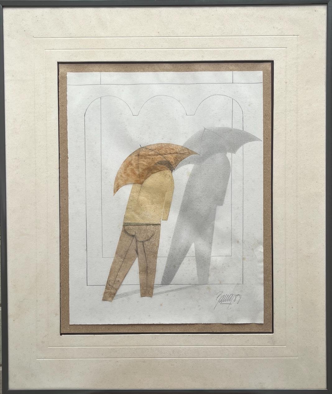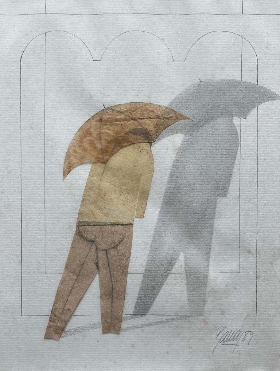 NELSON RAMOS (Escuela uruguaya, 1932-2006) Collage sobre cartulina «Serie Paraguas» Firmado y fechado «89» abajo a la derecha 32 x 25 cm Presenta pequeñas manchas de humedad