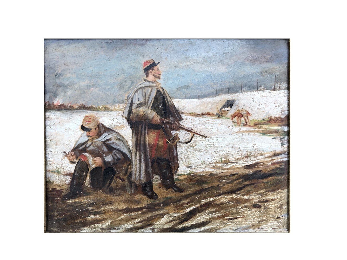 Cuadro anónimo. Óleo sobre madera. «Soldados de guardia en paisaje nevado.» 22 x 27 cm.