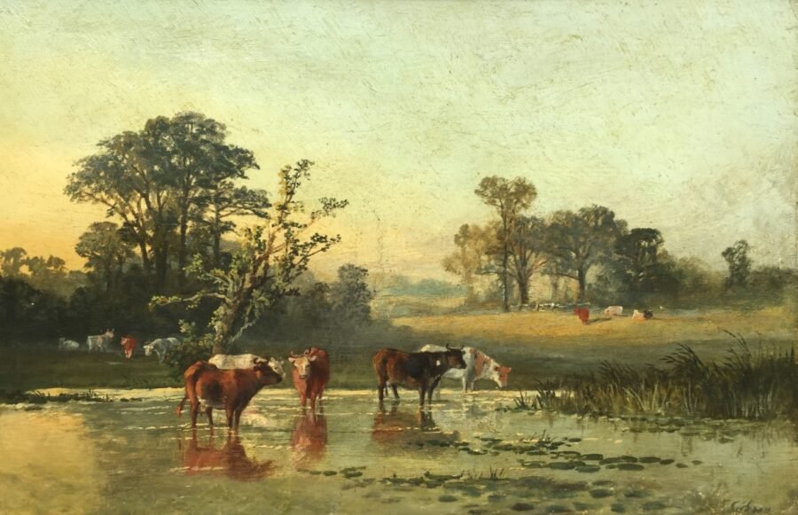 Firma ilegible (escuela inglesa, siglo XIX). Óleo sobre tela. «Paisaje con río y vacas.» Firmado abajo a la derecha. 21 x 31 cm.