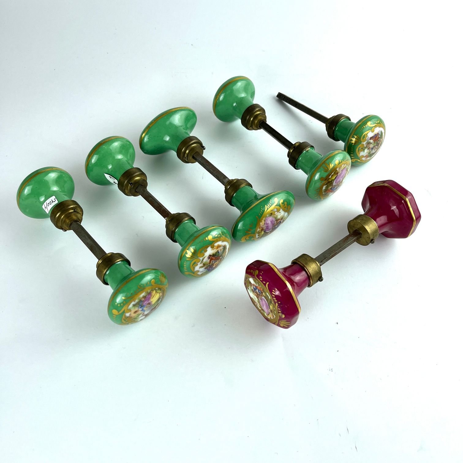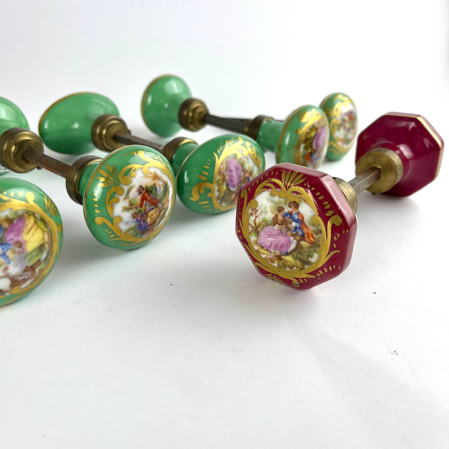 Once picaportes franceses en porcelana color verde y bordeaux pintados a mano «escenas galantes» con detalles en dorado.