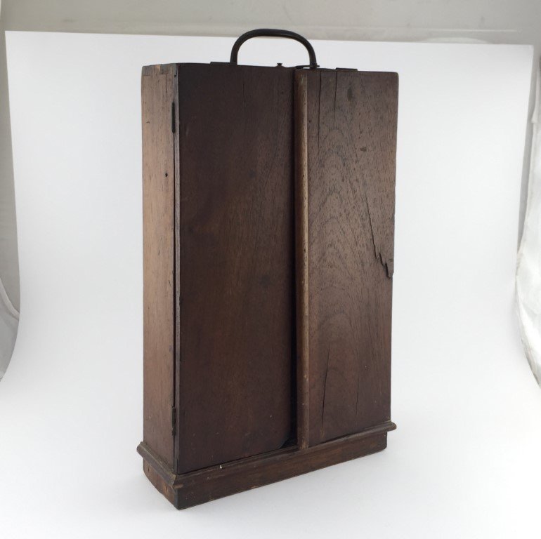 Oratorio italiano de viaje c. 1920. Caja en madera tallada y calada «formas góticas», decorada con dos exvotos. Escena interior en yeso policromado con detalles en oro. «Adoración a María.» Asa en bronce y ranura para limosna. Medidas abierto 68 x 50 cm.