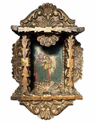 Oratorio hispanoamericano s. XIX en madera tallada y dorada, con imagen central pintada a mano al óleo «San José y el Niño». 60 x 45 x 20 cm.