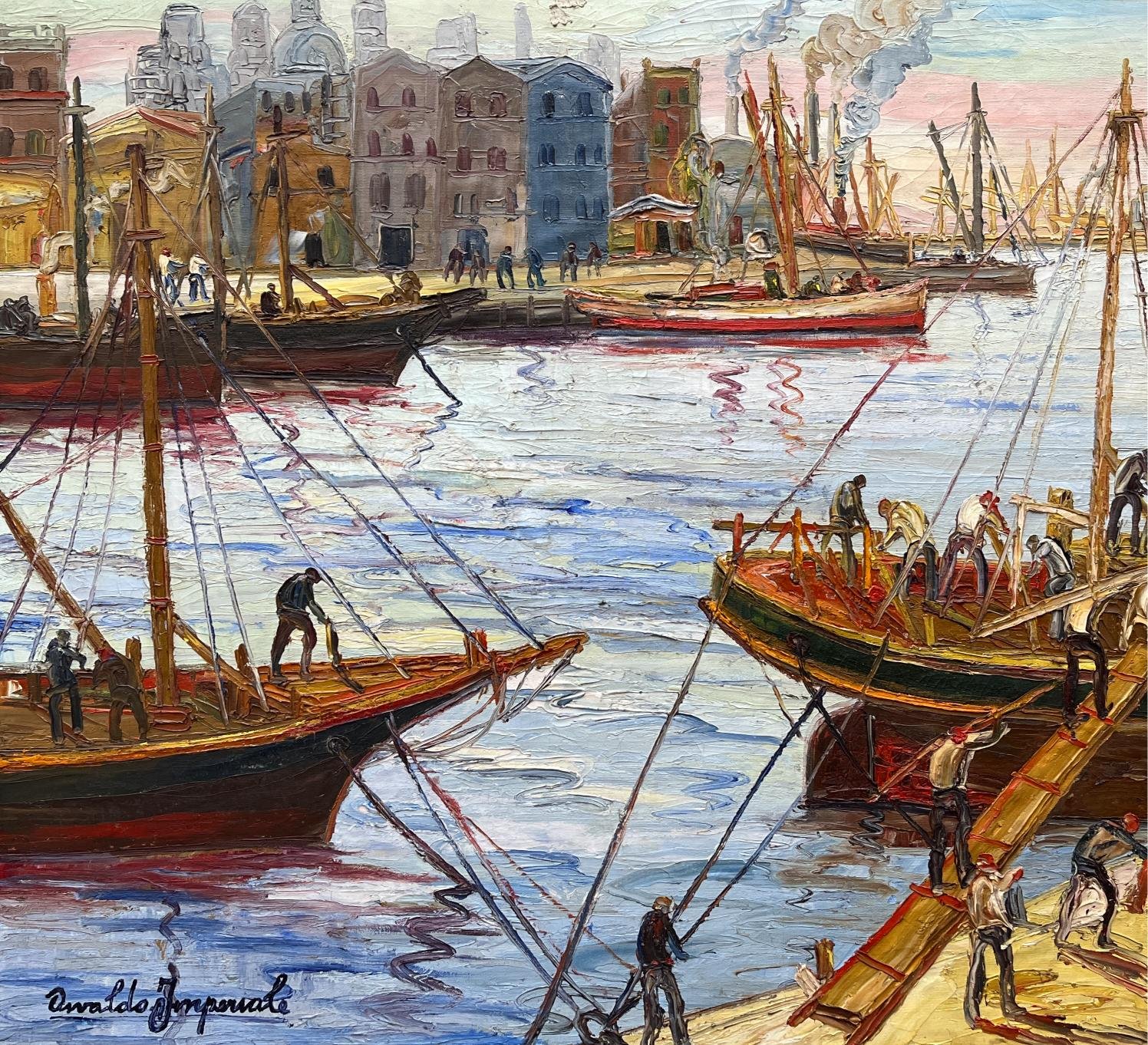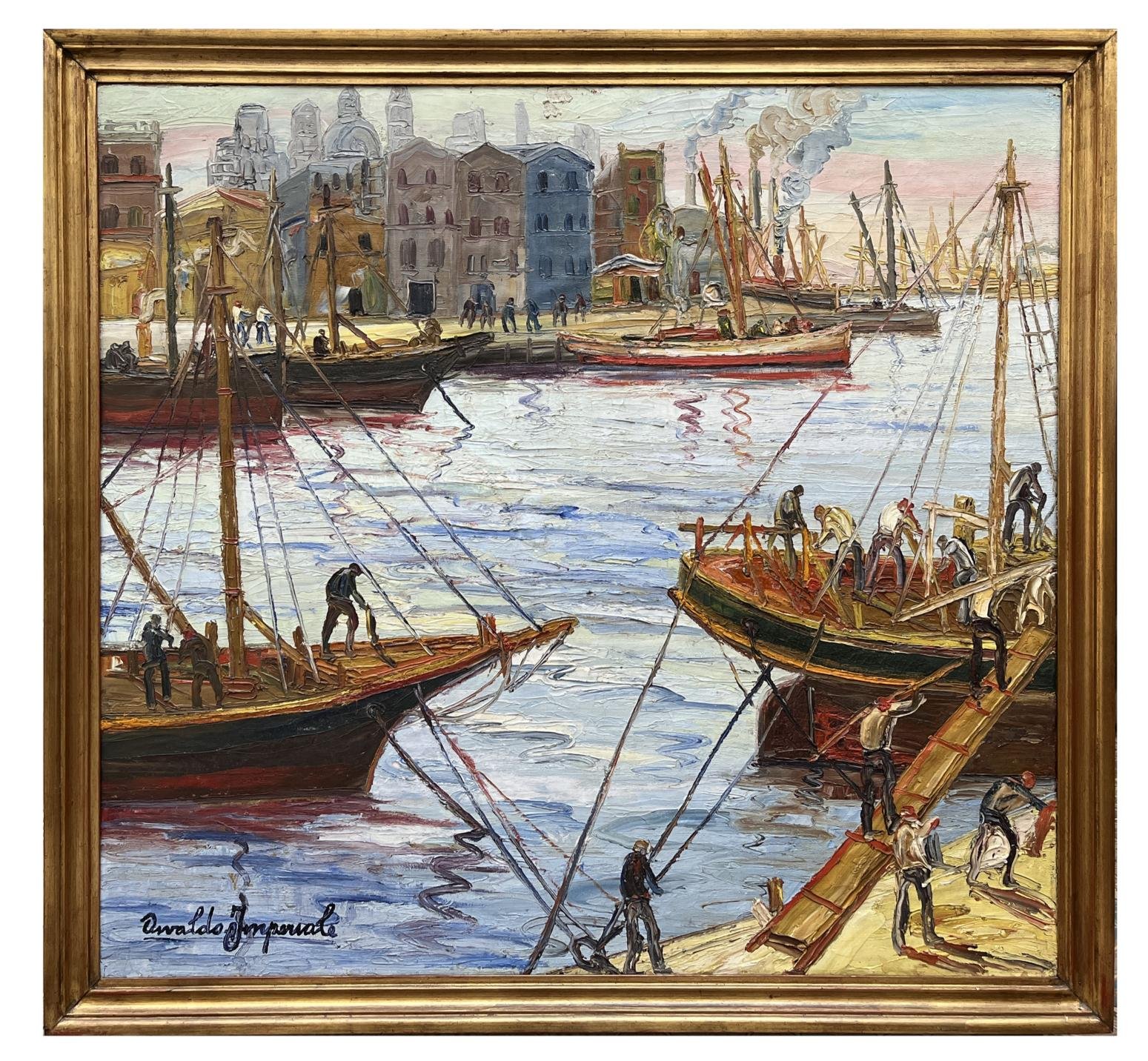 OSVALDO IMPERIALE (Escuela argentina, 1913-1977) Óleo sobre tela «Puerto de Buenos Aires» Firmado abajo a la izquierda 90 x 100 cm Reentelado