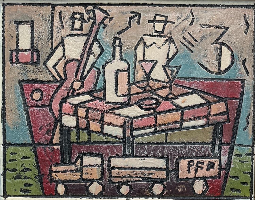PABLO PERALTA (Escuela uruguaya, 1959-2024) Técnica mixta sobre fibra “Bodegón constructivo» Firmado con iniciales «PFP» abajo a la derecha 18 x 22 cm
