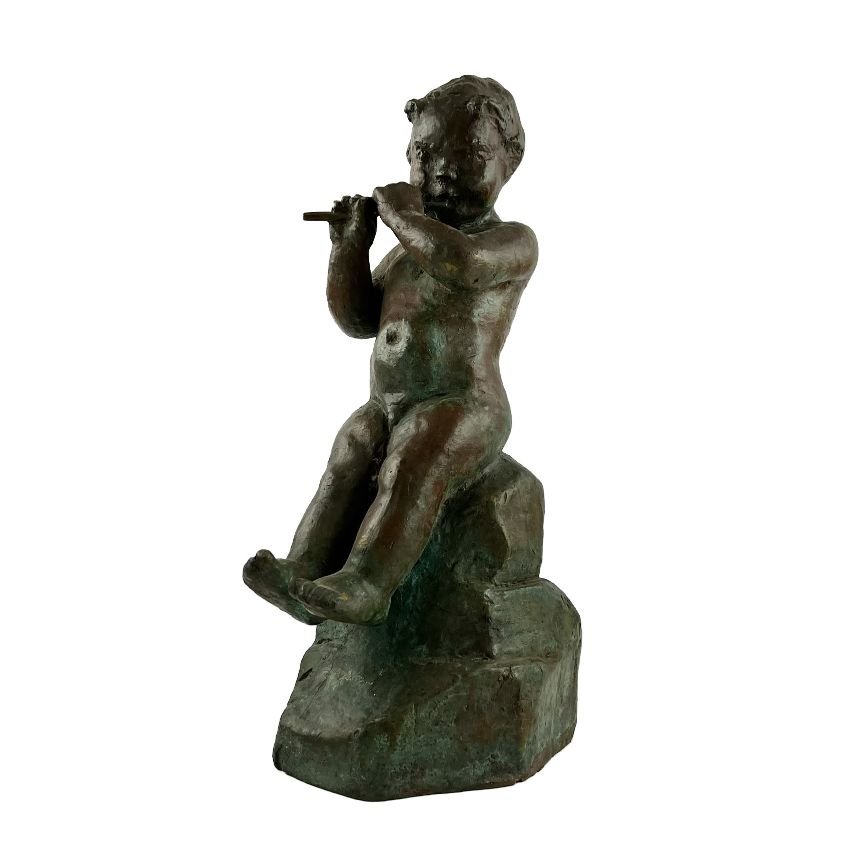 PABLO MAÑÉ (1921-2004) «Niño flautista» Escultura en bronce pátina verde Firmado en la base, con sello de la fundición W. Puppo Alto 28 cm