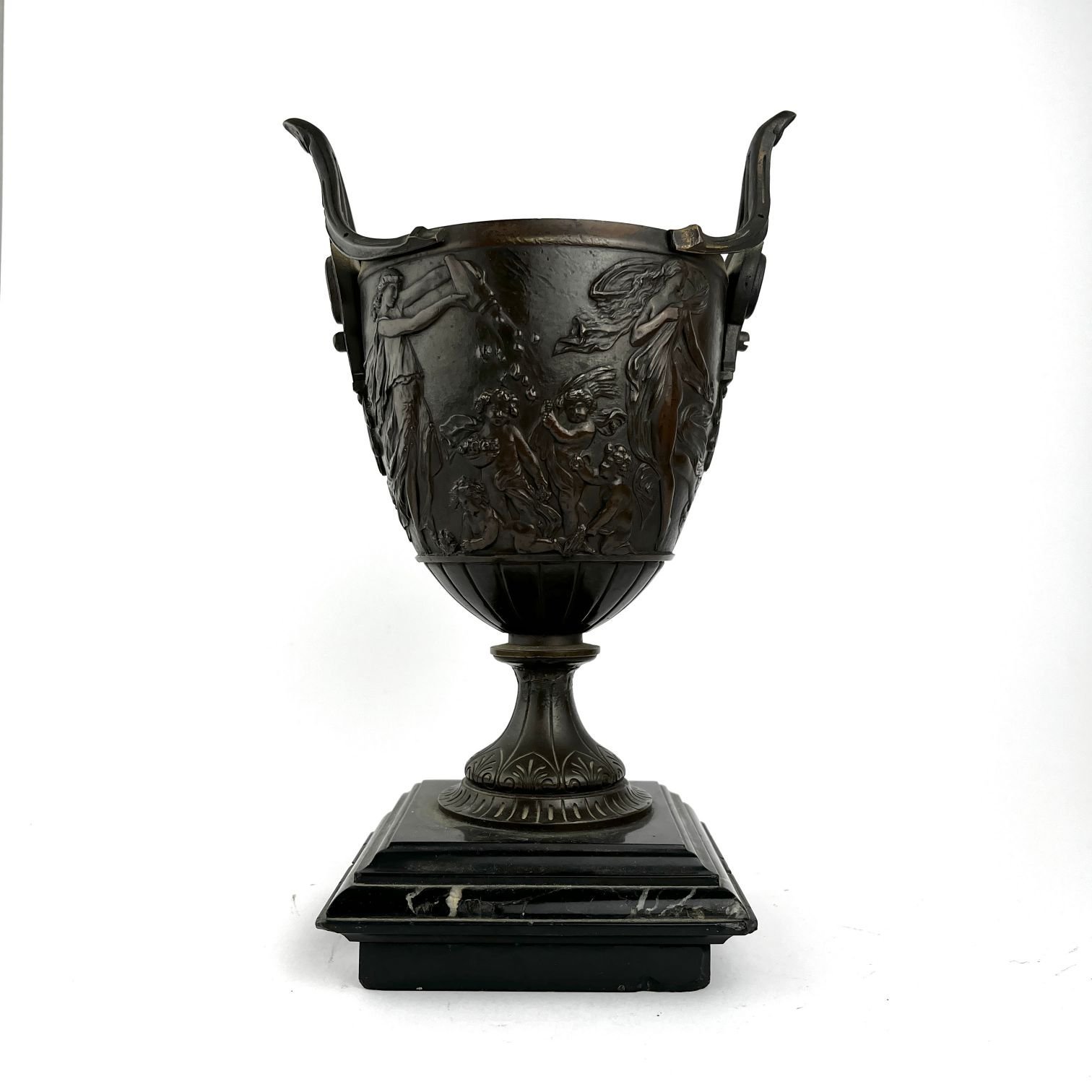 Par de copones franceses época Segundo Imperio en bronce pátina marrón cincelado «damas, niños y flores», con bases en ónix. Alto total 25 cm.
