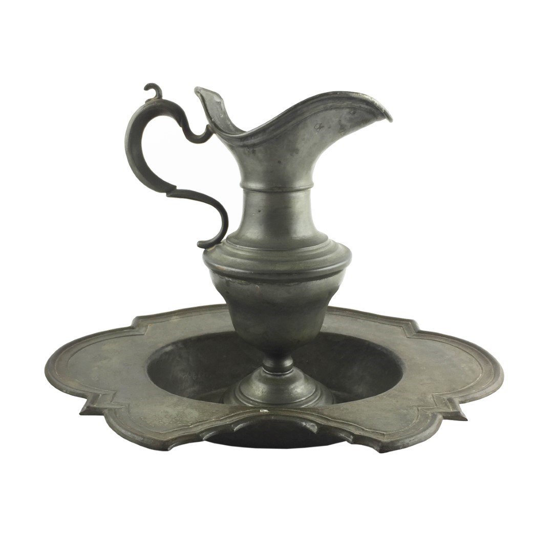 Conjunto de palangana de barbero y jarra siglo XIX. Palangana hecha a mano en cobre estañado, 7 x 37 x 27 cm. Jarra en peltre, alto 27 cm.