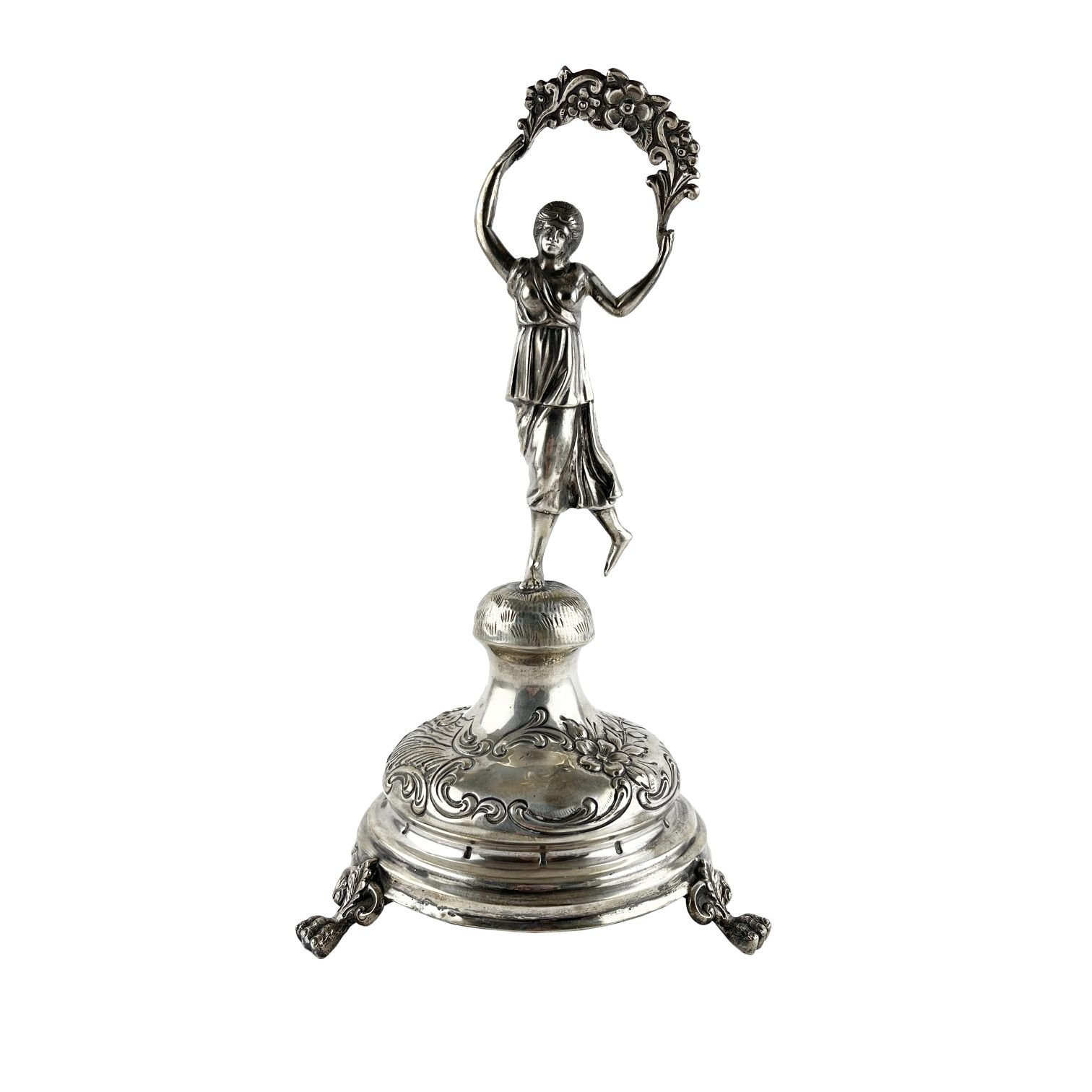 Palitero portugués en plata esculturado «dama con flores». Base redonda. Alto 27 cm.