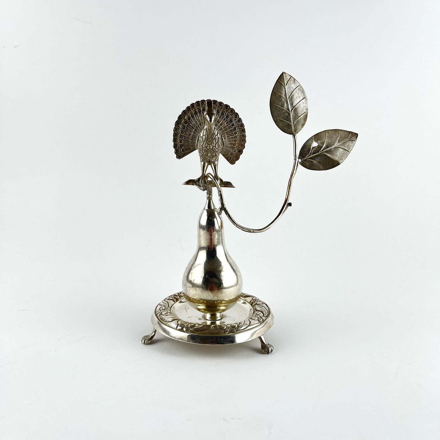 Palitero portugués en plata esculturado «fruto y pavo real». Base redonda. Alto 18 cm.