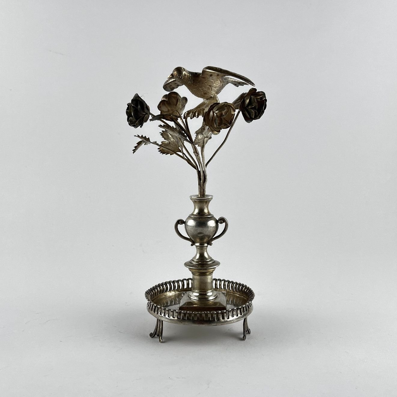 Palitero portugués en plata esculturado «copón con flores y ave». Base redonda calada. Alto 18 cm.