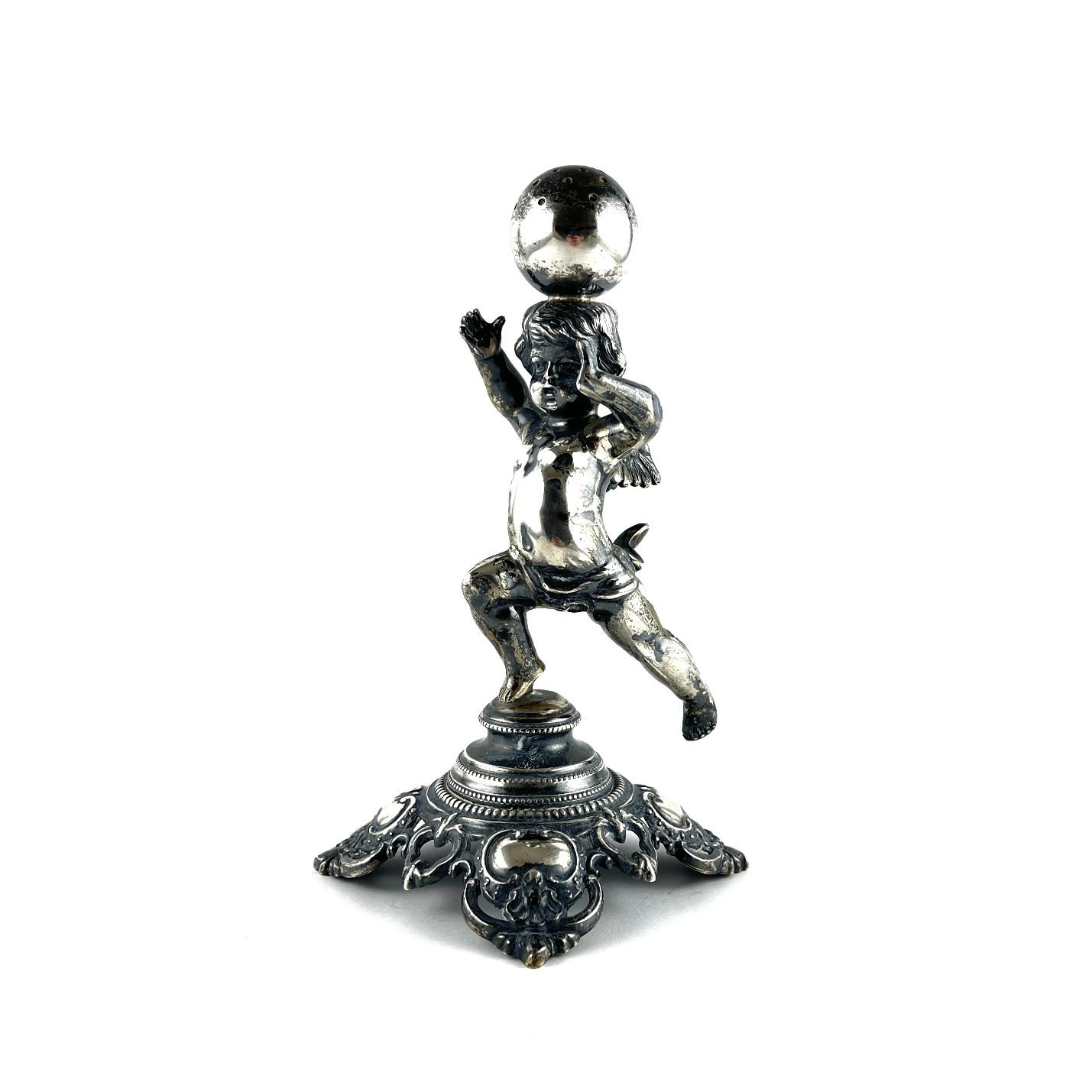 Palitero portugués en plata esculturado «ángel y esfera». Base cuadrada y calada. Alto 20 cm.