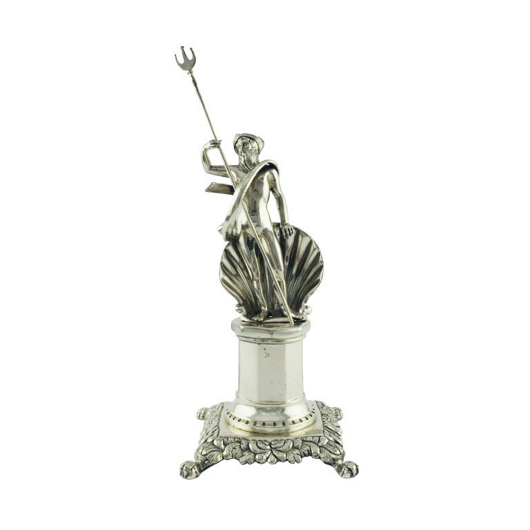 Palitero portugués en plata de Porto esculturada «Neptuno.» Base cuadrada cincelada «hojas», con cuatro patas en forma de garra. Alto 21 cm.