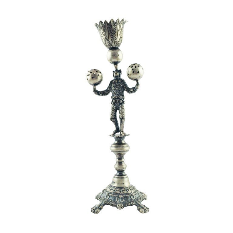 Palitero portugués en plata 833 esculturada «malabarista», con sello del orfebre Alves Pinto. Base redonda cincelada «hojas y flores», con cuatro patas en forma de garra. Alto 23 cm.