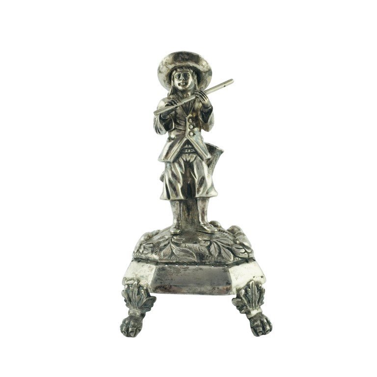 Palitero portugués en plata de Porto s. XIX esculturada «joven flautista». Base cuadrada decorada «flores», con cuatro patas esculturadas «garras». 17 x 9 x 8 cm.