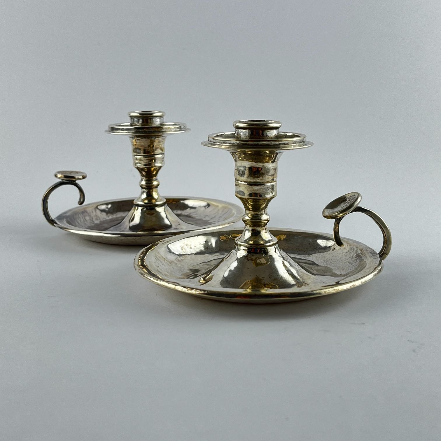Par de palmatorias hispanoamericanas s. XVIII en plata lisa batida con fanales en cristal esmerilado. Alto 19 cm.
