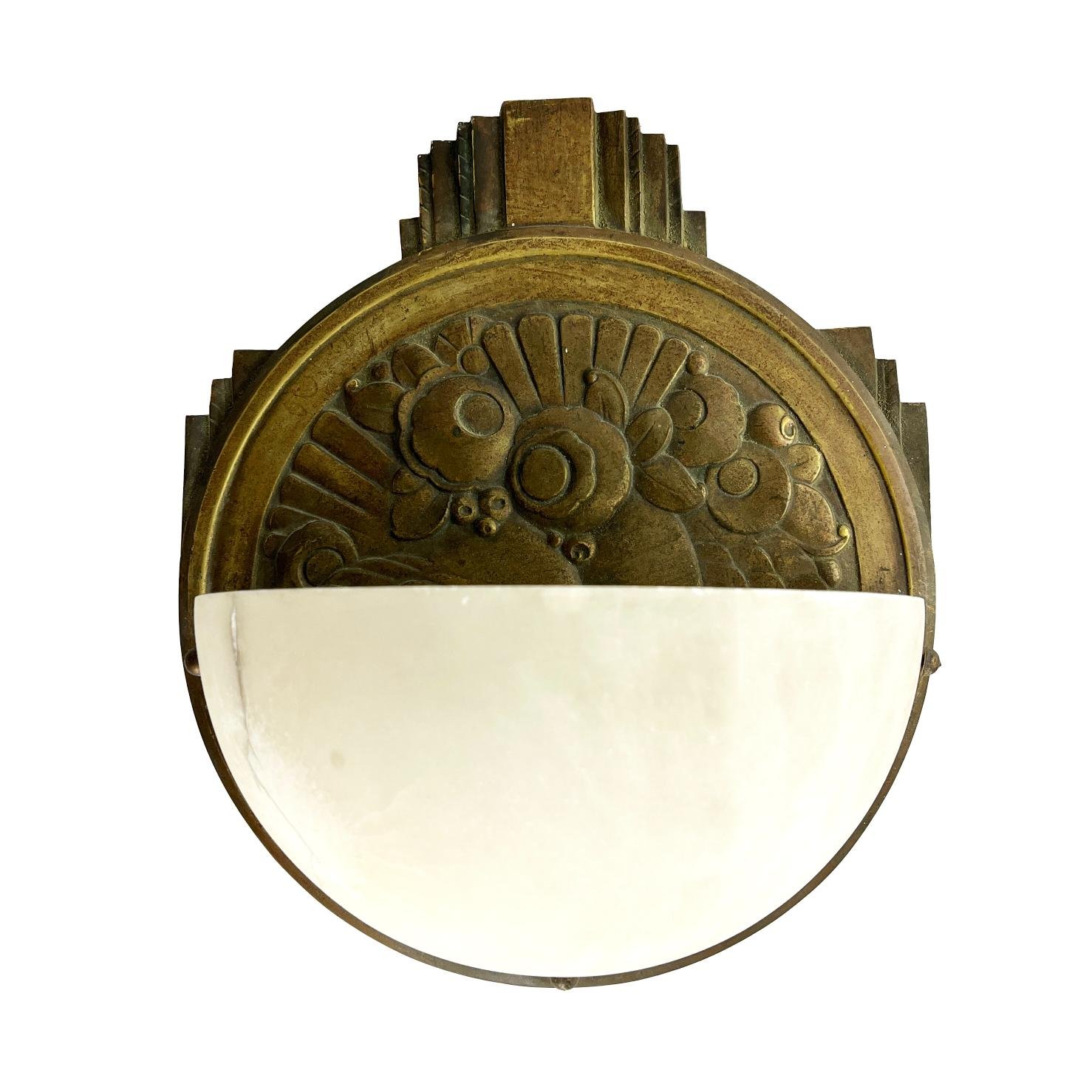 Par de apliques art decó en bronce dorado decorado «hojas y flores», con pantallas en alabastro, realizados por Georges Béal (Francia, 1884-1969). Pantallas restauradas.
