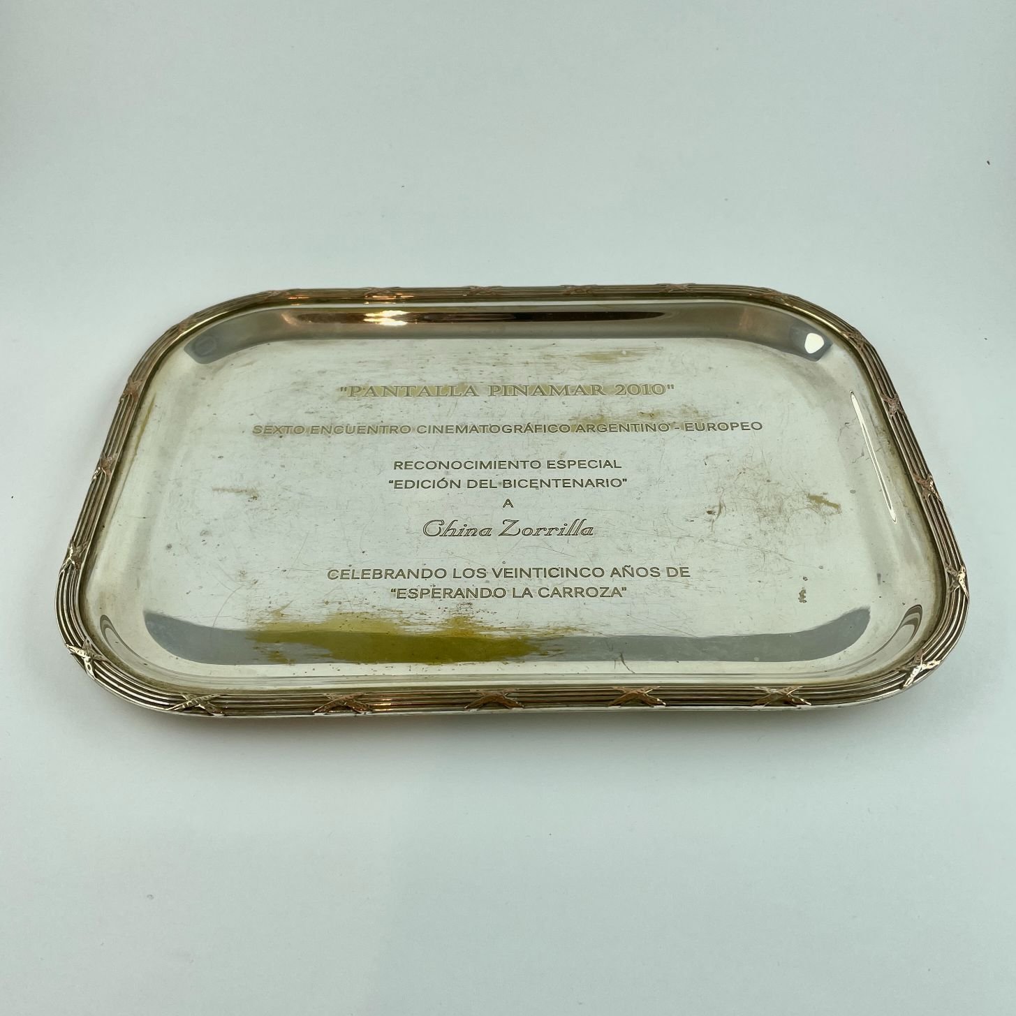 Par de bandejas rectangulares en metal plateado con borde estilo Luis XVI e inscripciones «Pantalla Pinamar 2009. Quinto encuentro cinematográfico argentino-europeo. A China Zorrilla, gran dama del cine argentino» y «Pantalla Pinamar 2010. Sexto encuentro cinematográfico argentino-europeo. Reconocimiento especial edición Bicentenario. A China Zorrilla. Celebrando los veinticinco años de Esperando la Carroza.» 33 x 24 cm.
