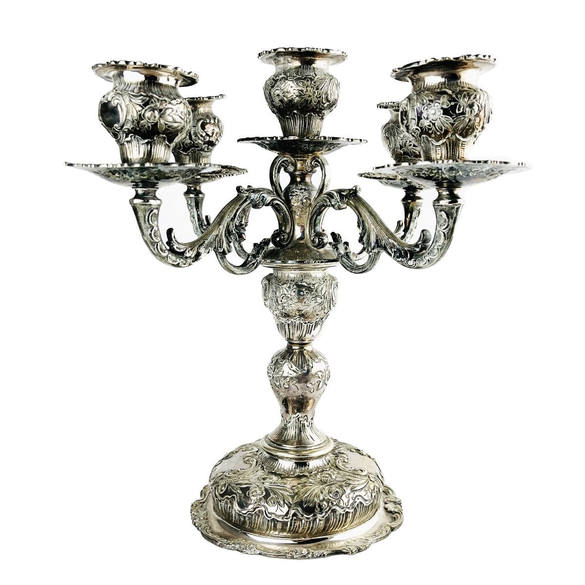Par de candelabros alemanes, cinco luces con opción a candelero, en plata cincelada «hojas y flores». Alto 26 cm. Peso total 2.170 gr.