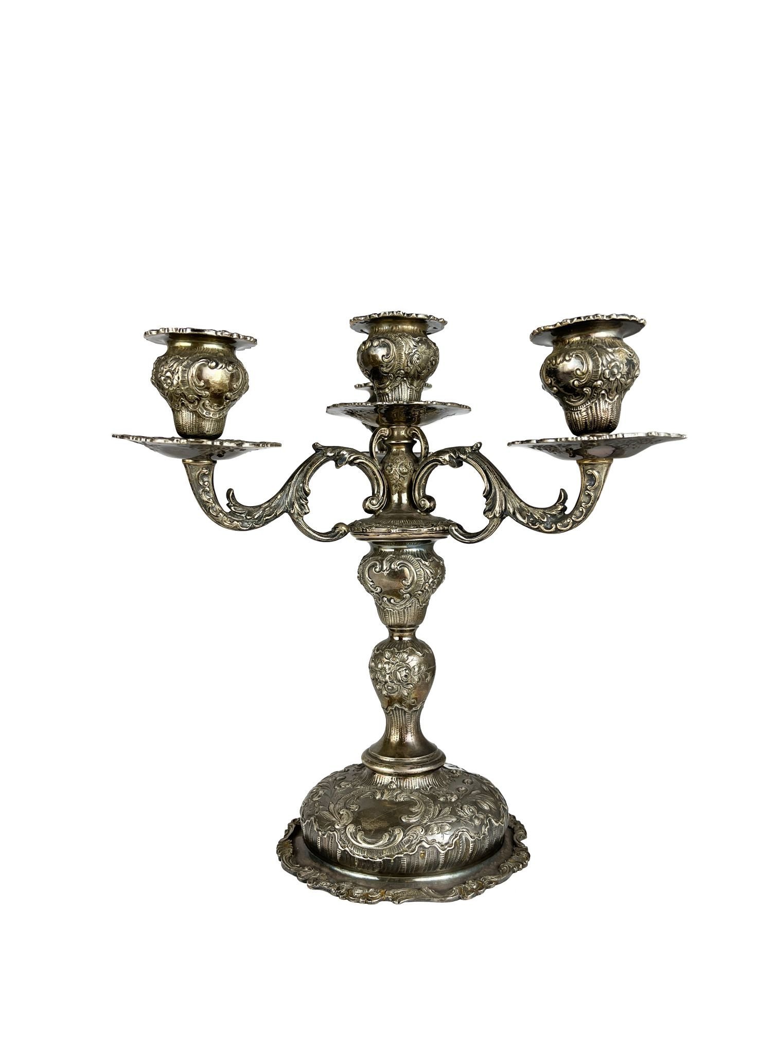 Par de candelabros cuatro luces, con opción a candelero, en plata alemana 935 cincelada «hojas y flores». 27 x 24 cm. Peso 2.036 gr.