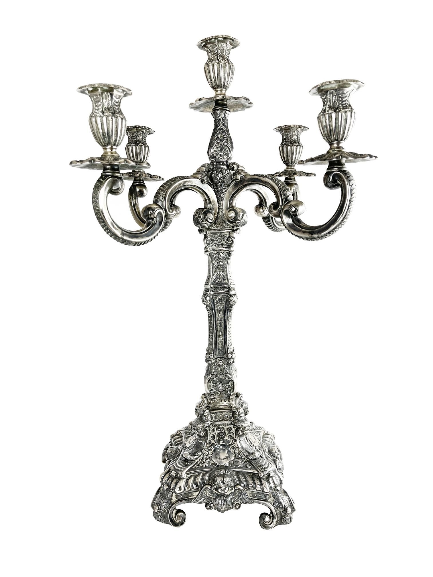 Par de candelabros portugueses, cinco luces, en plata cincelada «hojas y flores», esculturados «caras de felino» y «ángeles». Alto 56 cm. Diámetro 39 cm. Peso 12.400 gr.