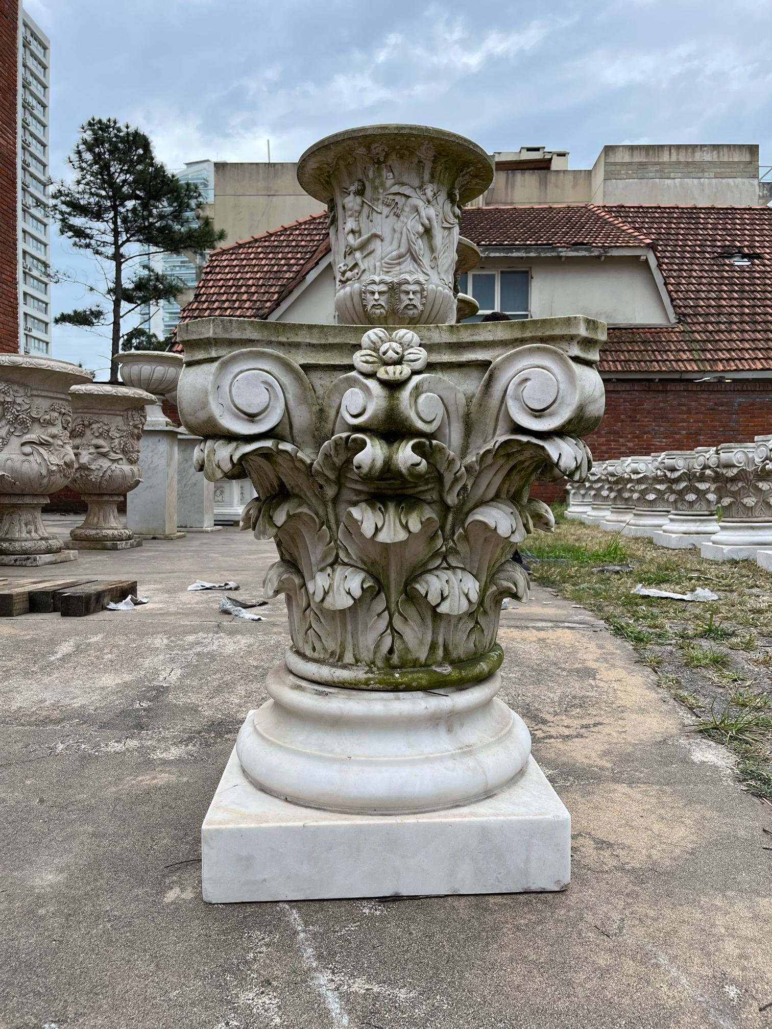 Par de capiteles corintios en mármol blanco veteado, con pedestales en mármol liso. Alto total 76 cm. Ancho 56 cm. Profundidad 56 cm.