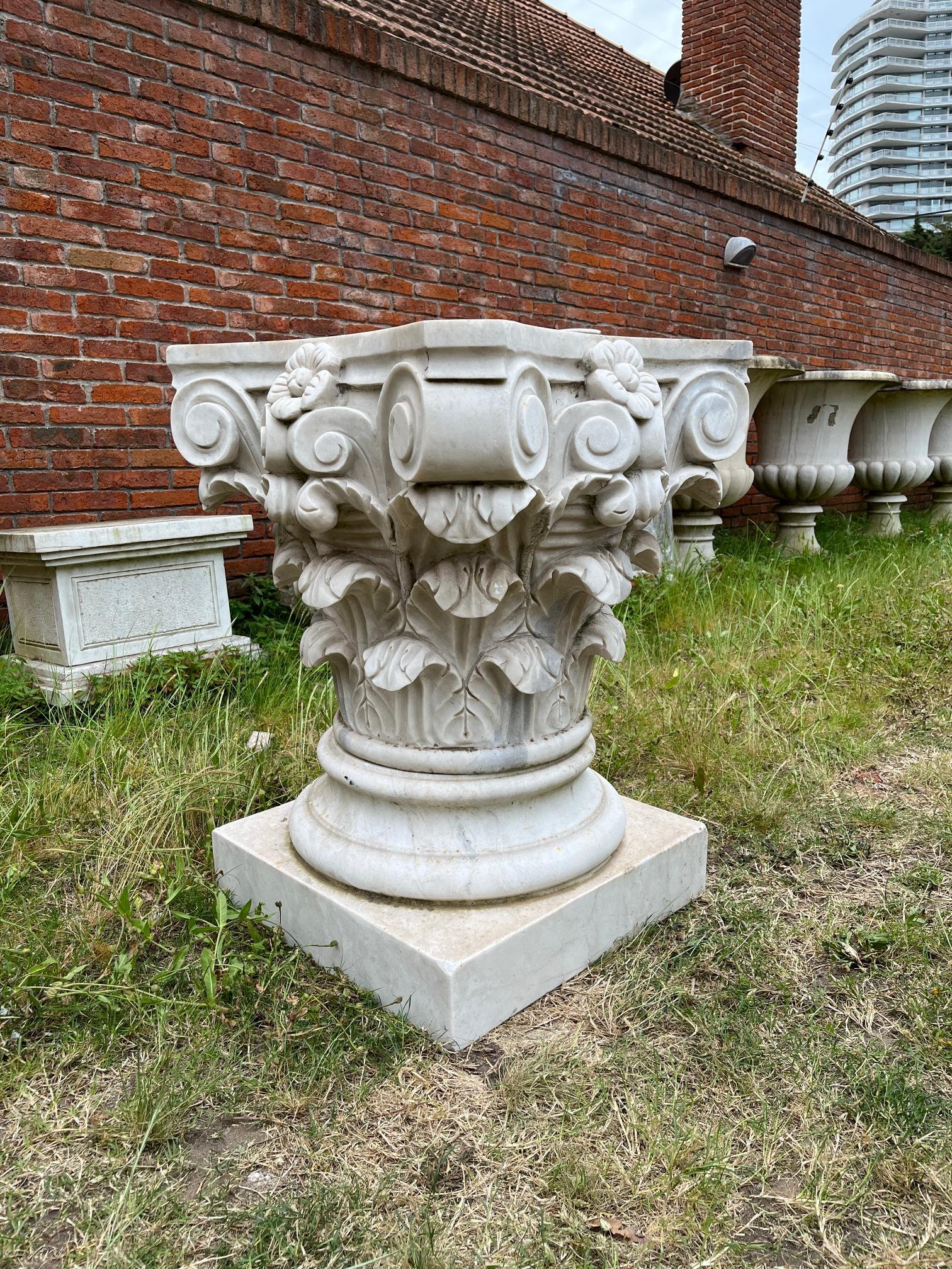 Par de capiteles corintios en mármol blanco veteado, con pedestales en mármol liso. Alto total 76 cm. Ancho 56 cm. Profundidad 56 cm.