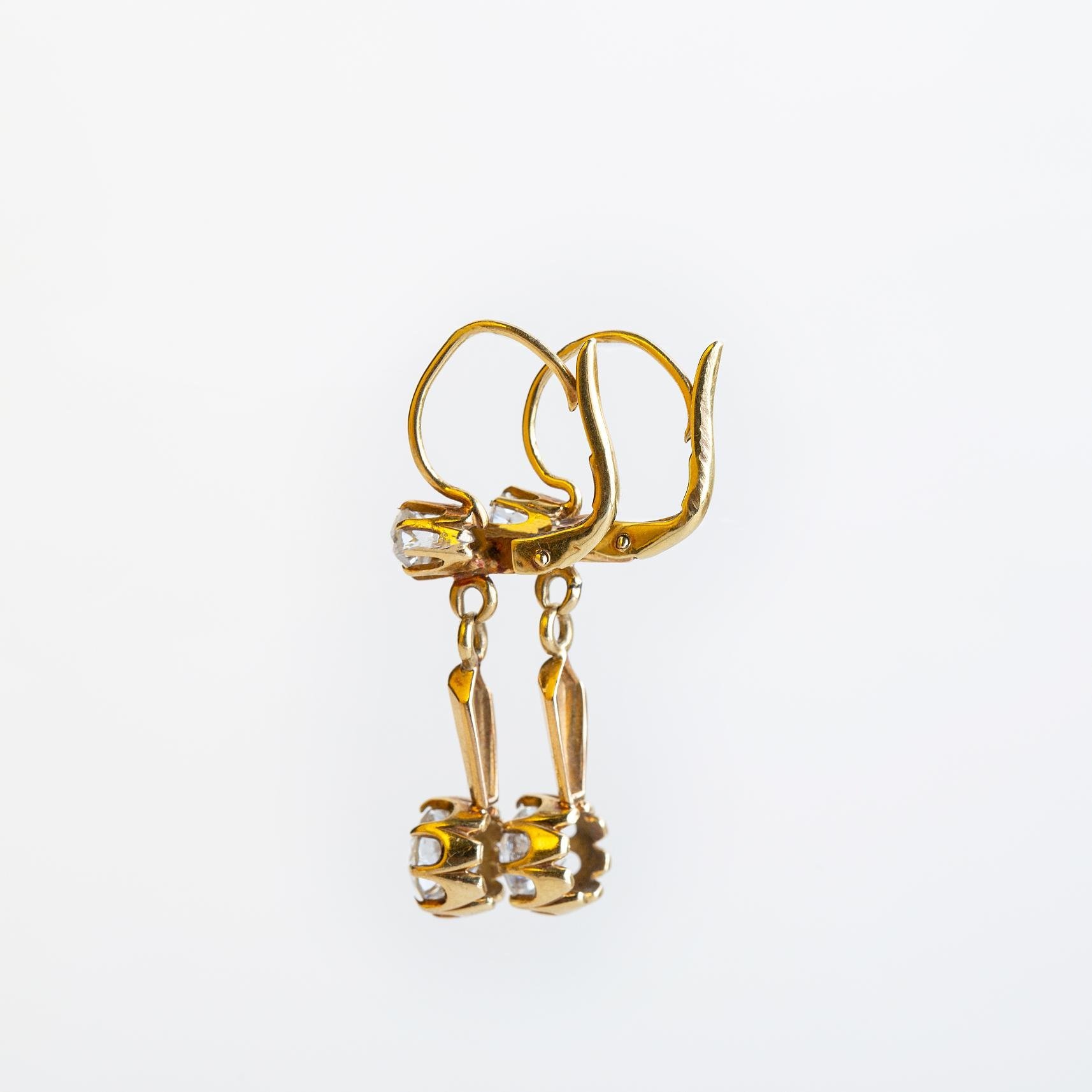 Par de caravanas en oro 18 K amarillo, una de ella con dos brillantes de 0.60 ct aprox. y 0.15 ct aprox., otra con dos brillantes de 0.50 y 0.15 ct aprox. Largo 25 mm. Peso bruto 3 gr.