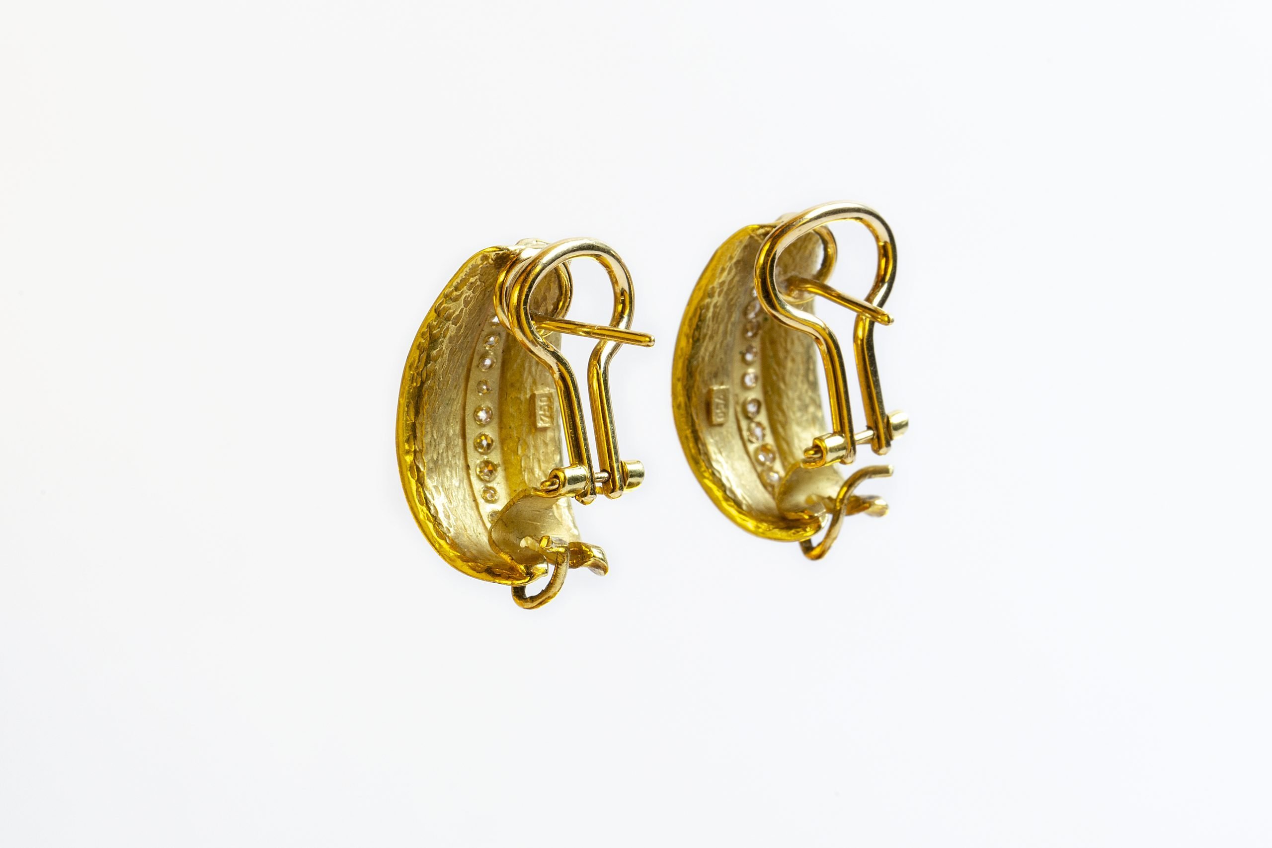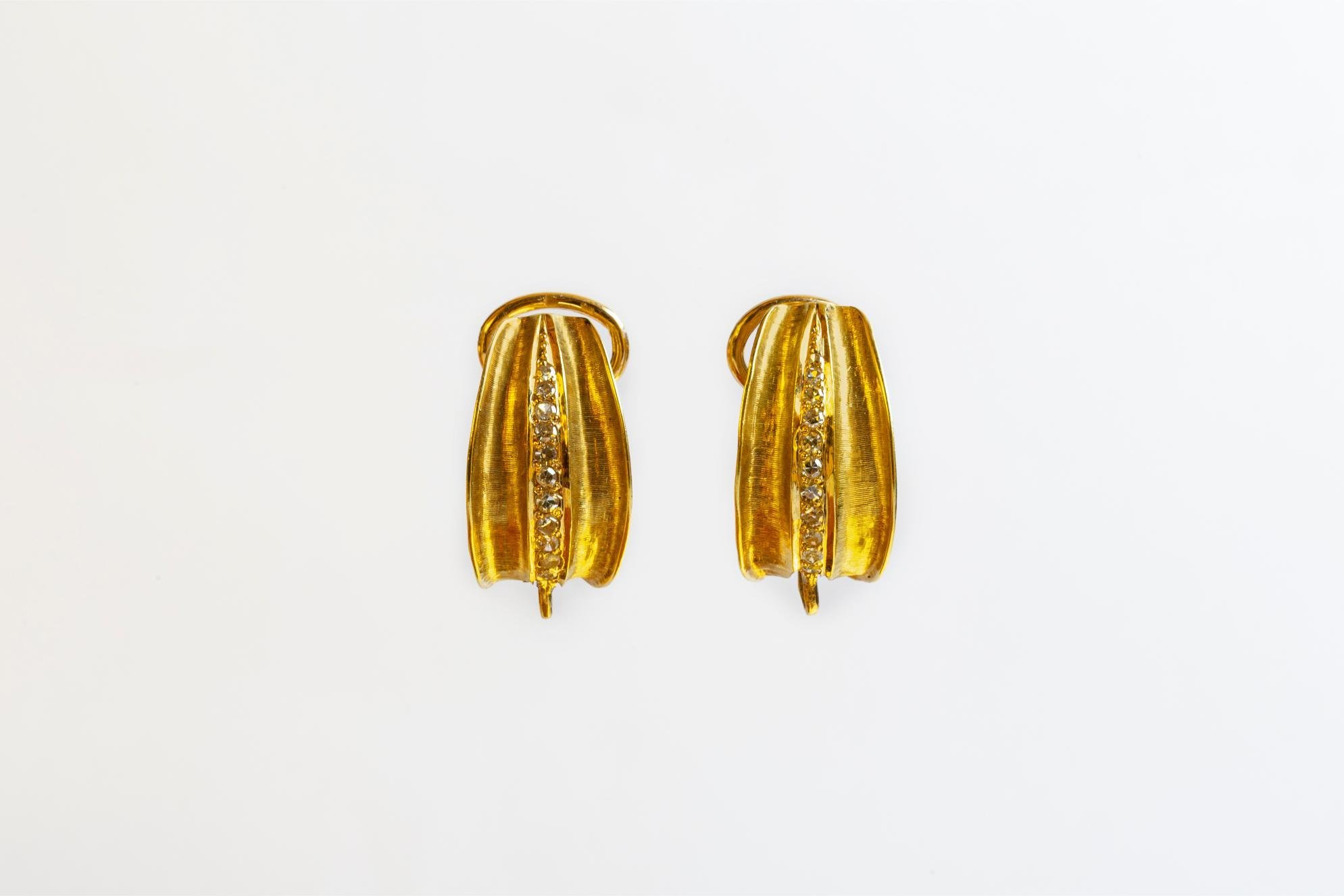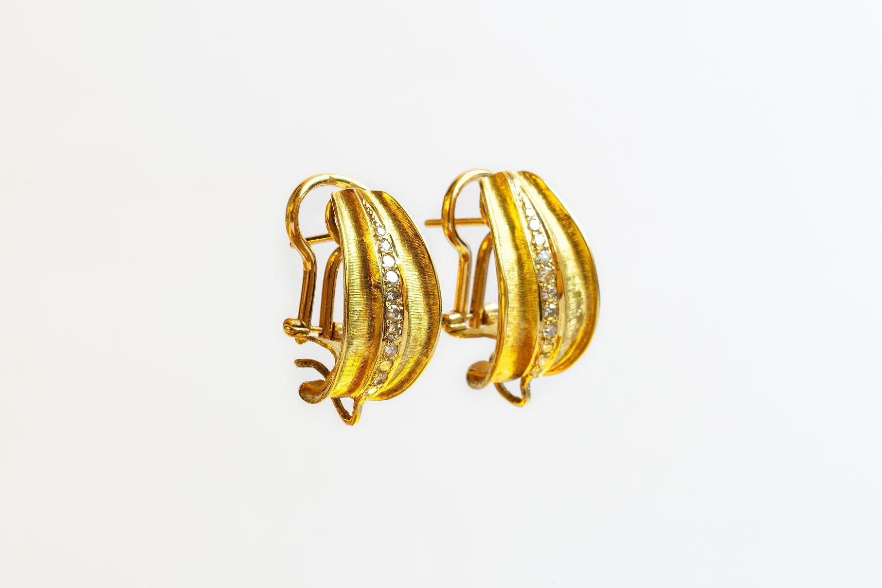 Par de caravanas tipo clip en oro 18 K amarillo con once pequeños brillantes cada una. Peso bruto 9 gr.