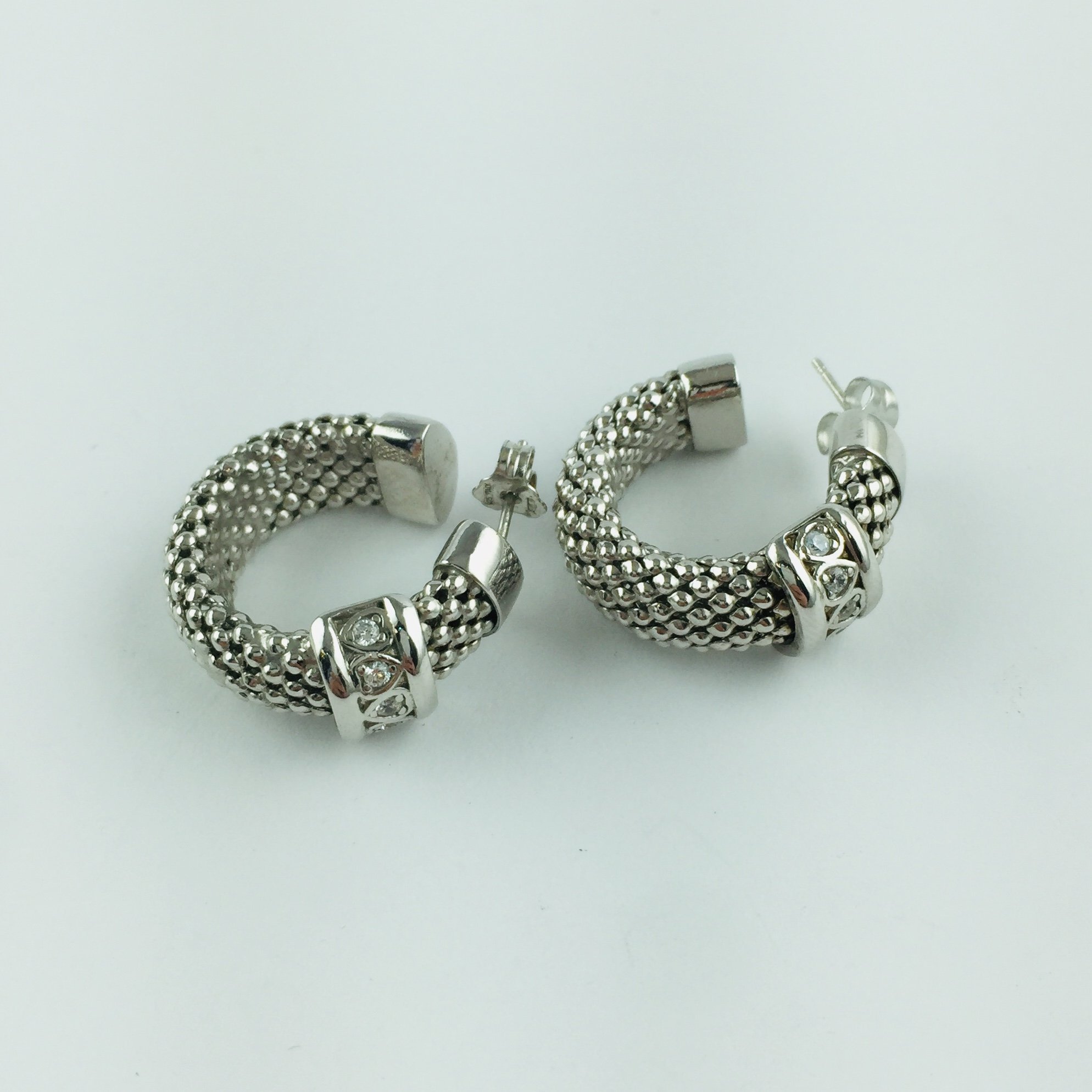 Par de caravanas en oro 18 K blanco decoradas con cinco pequeños brillantes cada una. Peso bruto 11.7 gr.