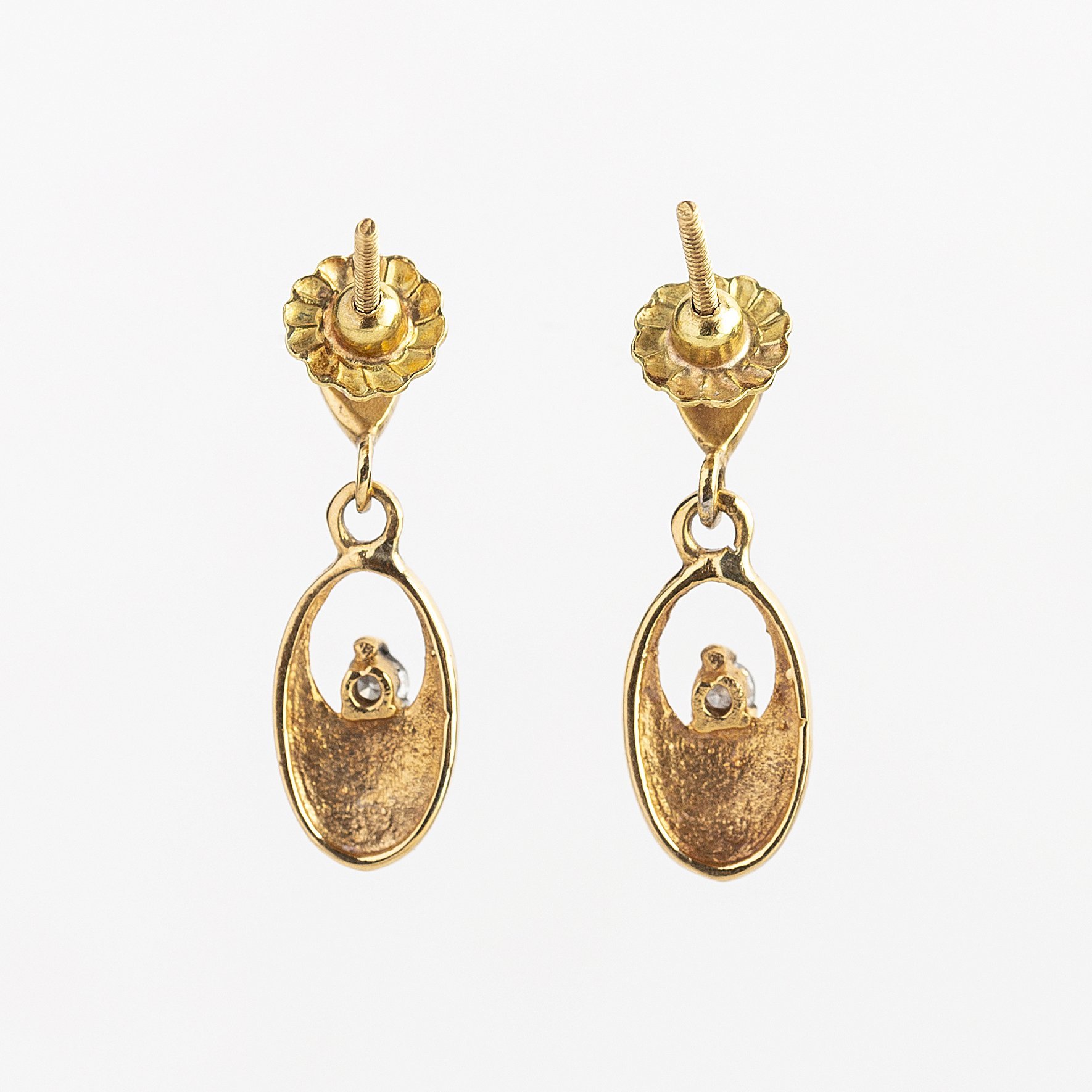 Par de caravanas en oro blanco y amarillo con un pequeño brillante central cada una.