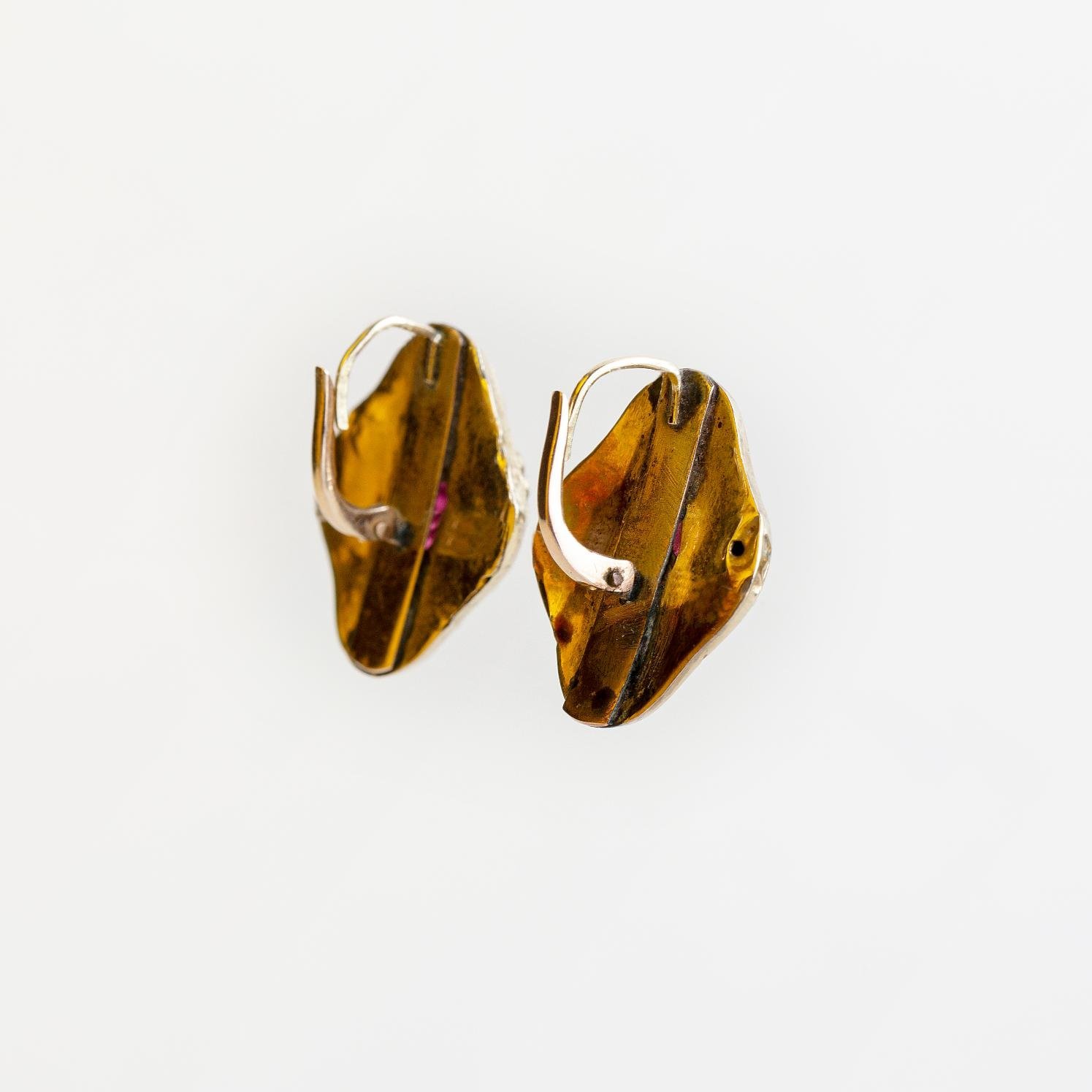 Par de caravanas s. XIX en oro amarillo, cada una con un rubí central y una pequeña perla natural. 19 x 15 mm. Peso bruto total 2 gr.