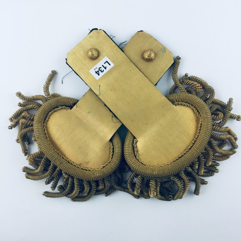 Par de charreteras del ejército uruguayo en bronce dorado, decorada con canelones en filigrana dorada. Botón con escudo Nacional uruguayo. Pequeñas averias.