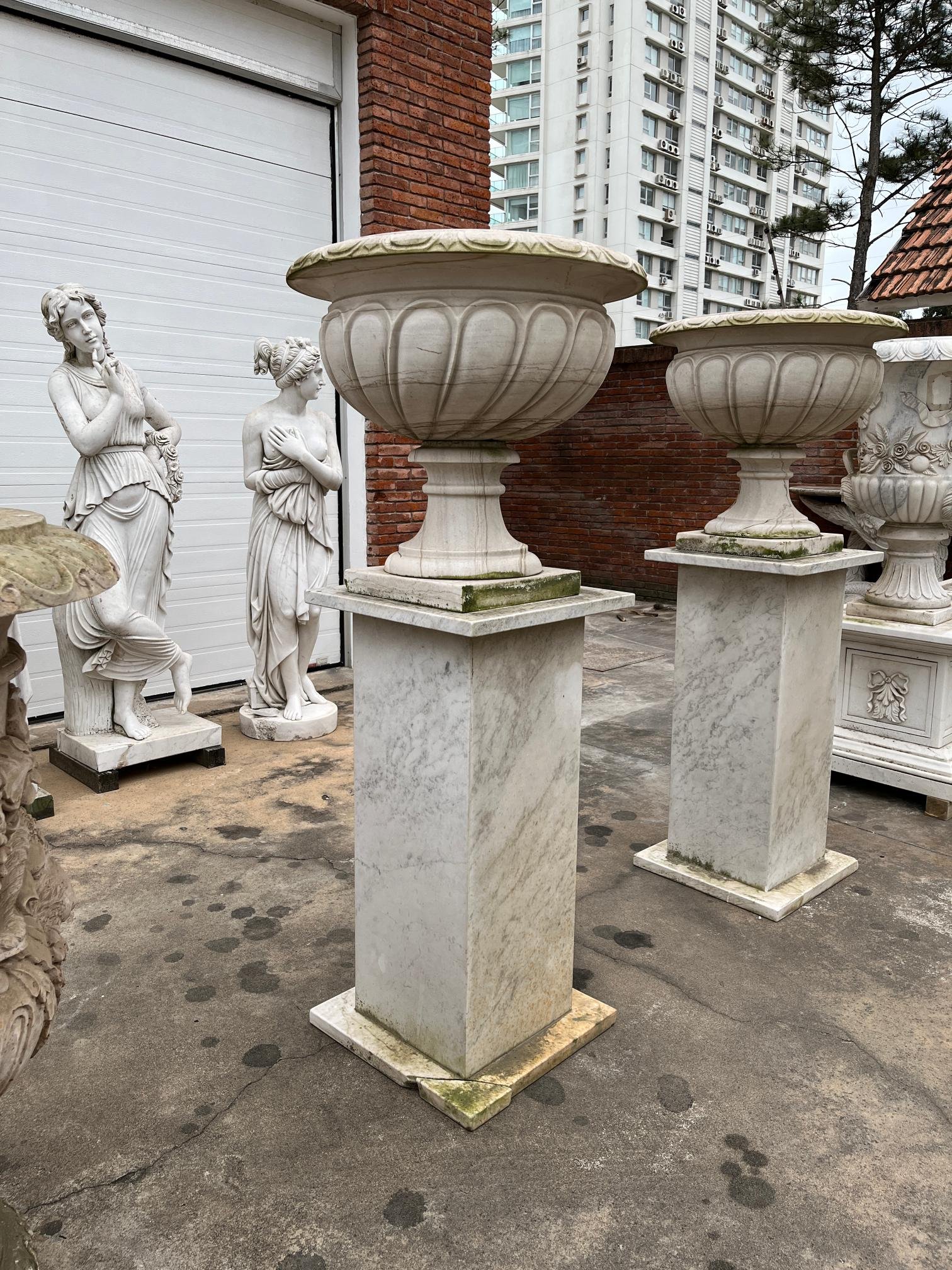 Par de copones en mármol veteado blanco y lobulado con borde tallado «hojas». Presentados sobre pedestales cuadrados en mármol blanco veteado. Alto 165 cm. Diámetro 72 cm.