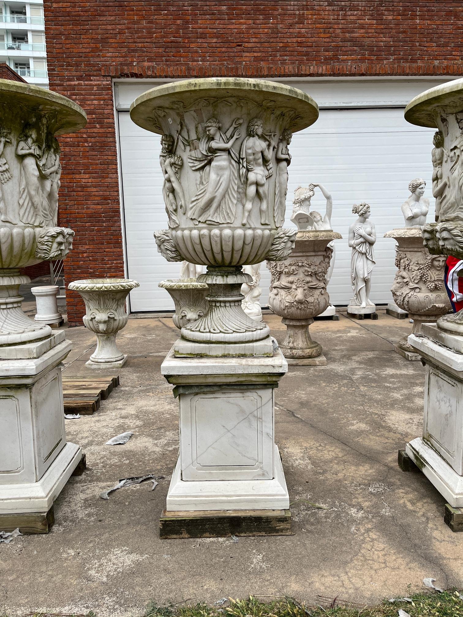 Par de copones en mármol blanco veteado, con friso tallado «personajes griegos», laterales tallados «máscaras» y guarda lobulada. Presentados sobre pedestales en mármol blanco veteado, de base cuadrada. Alto total 158 cm. Diámetro 75 cm.