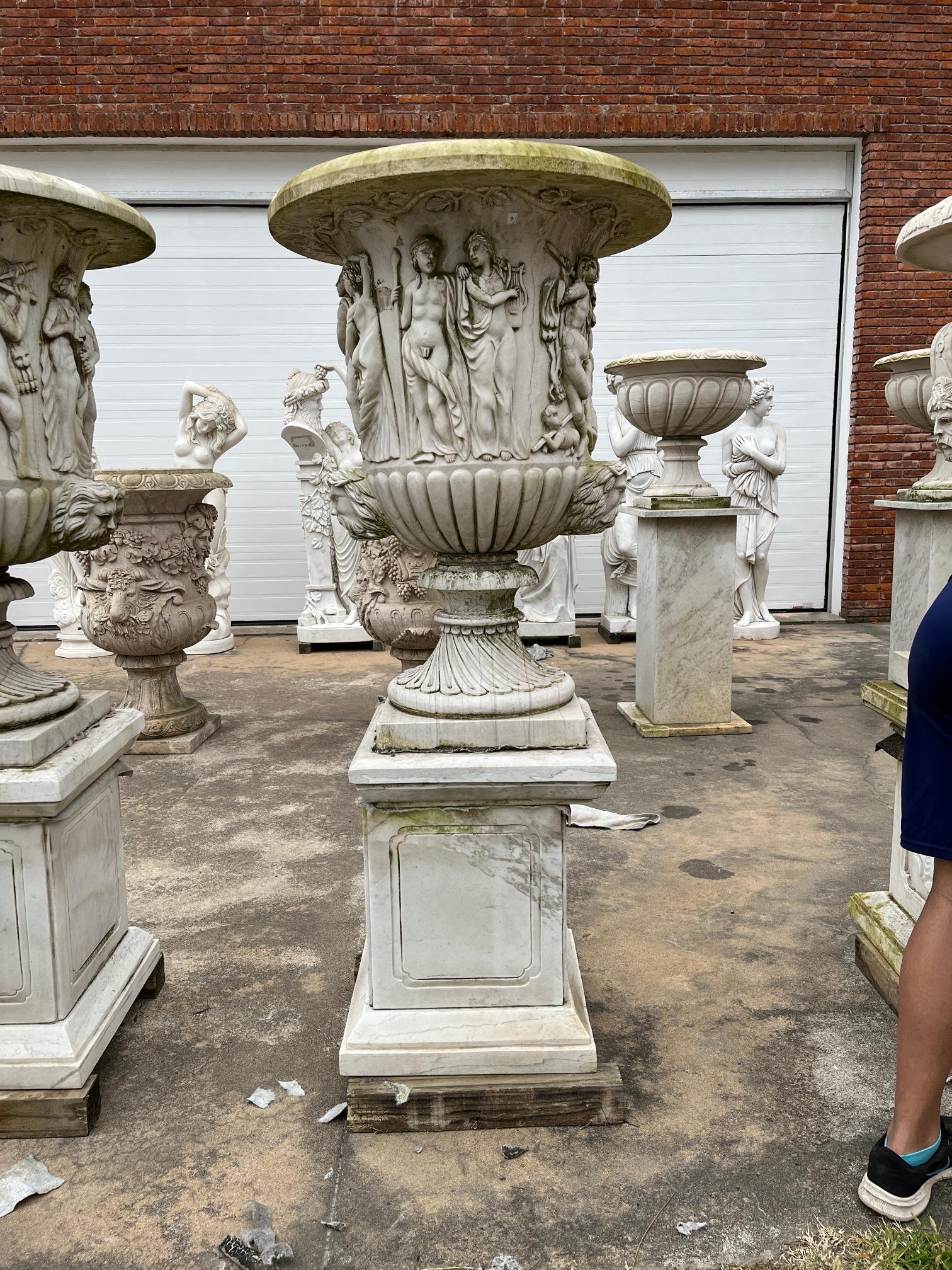 Par de copones en mármol blanco veteado, con friso tallado «personajes griegos», laterales tallados «máscaras» y guarda lobulada. Presentados sobre pedestales en mármol blanco veteado, de base cuadrada. Alto total 158 cm. Diámetro 75 cm.