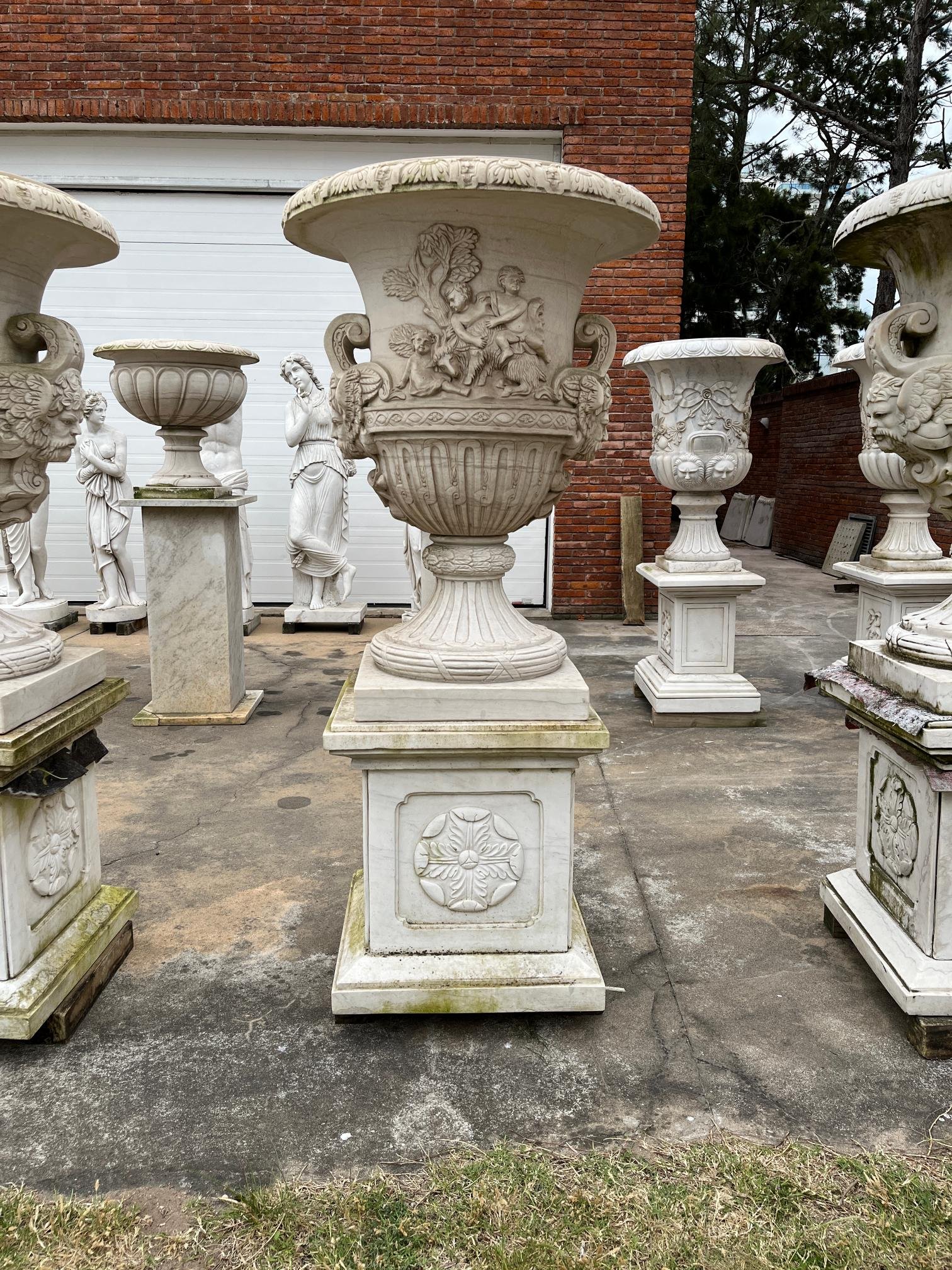 Par de copones en mármol blanco estilo Luis XVI tallados «niños y cisnes», con dos asas esculturadas «máscaras». Presentados sobre pedestales tallado «flores», de bases cuadradas. Alto total 160 cm. Diámetro 73 cm.