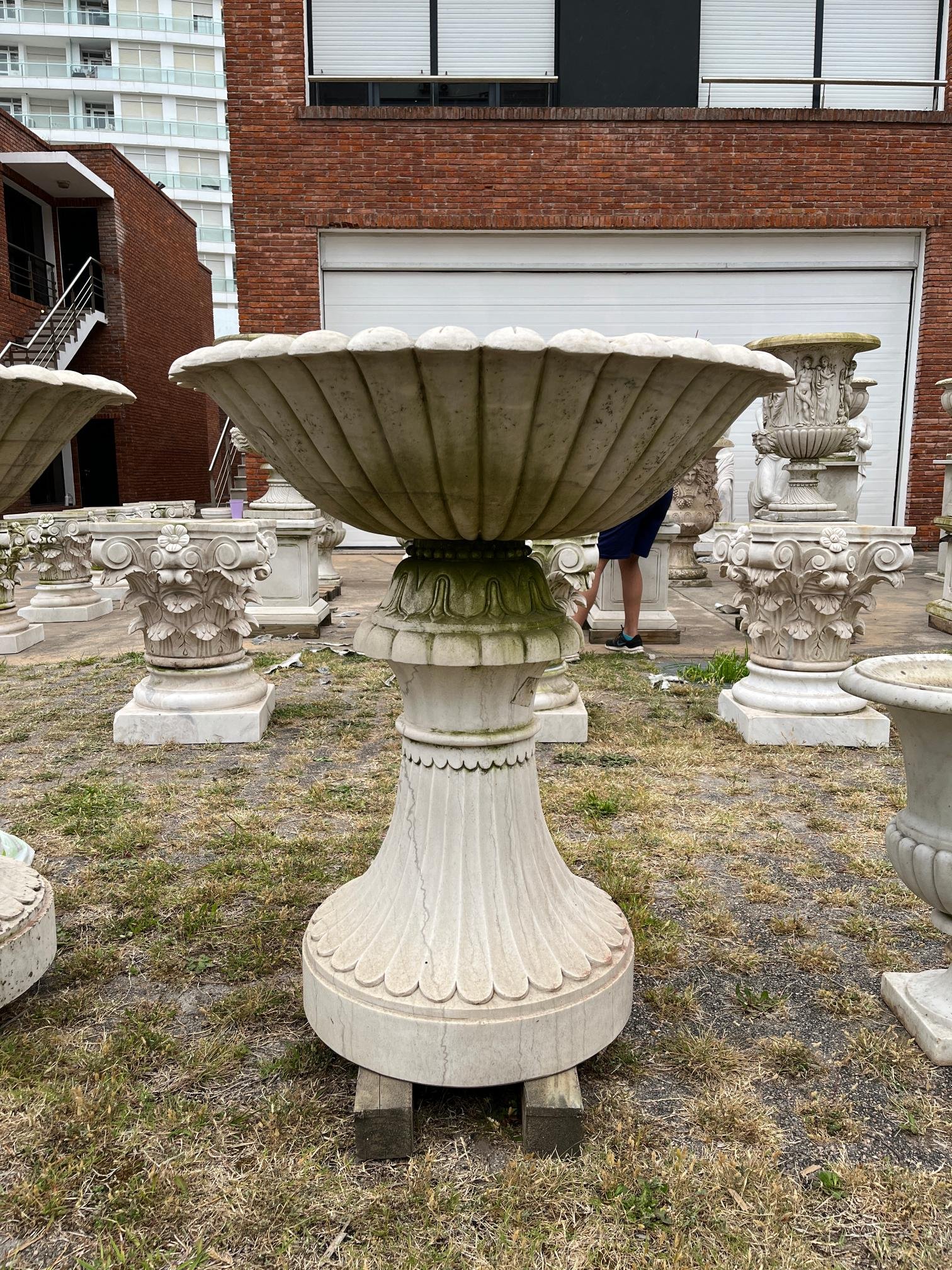 Par de copones en mármol blanco veteado, de cuerpos lobulados. Alto 101 cm. Diámetro 90 cm. Uno averiado.