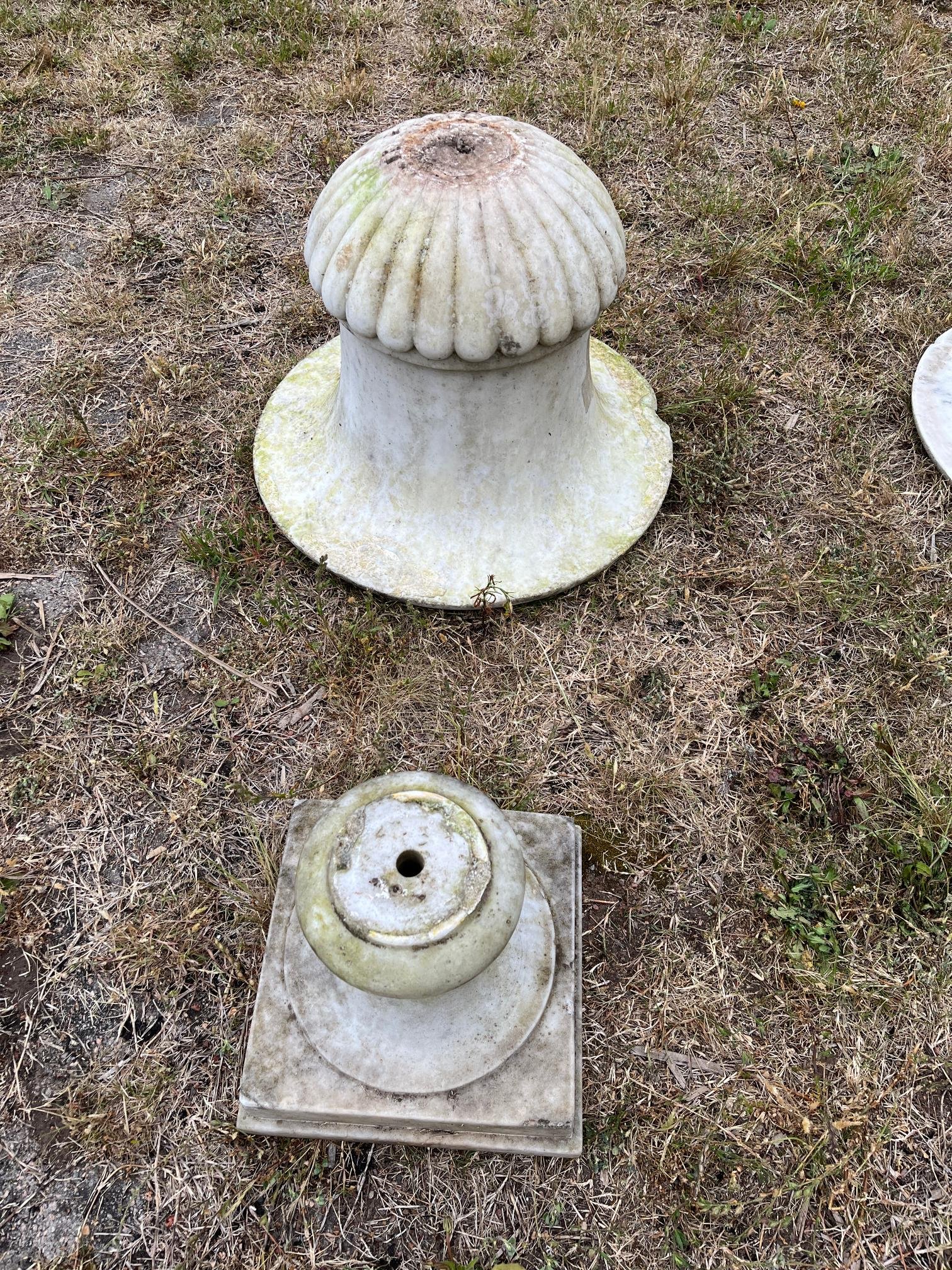 Par de copones en mármol blanco veteado, con friso lobulado. Alto total 70 cm. Diámetro 45 cm. Desarmados, averiados y con faltantes.