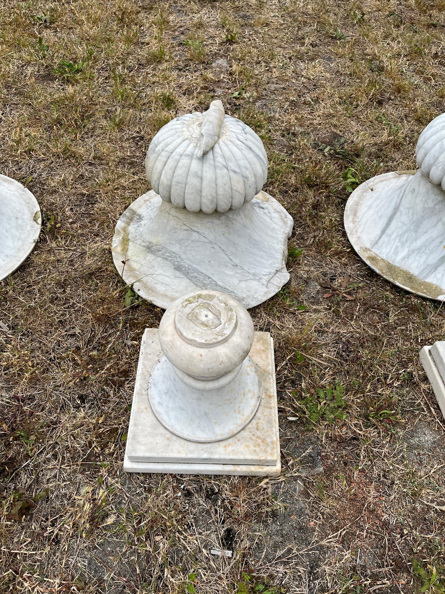 Par de copones en mármol blanco veteado con friso lobulado. Alto total 70 cm. Diámetro 45 cm. Desarmados, averiados y con faltantes.