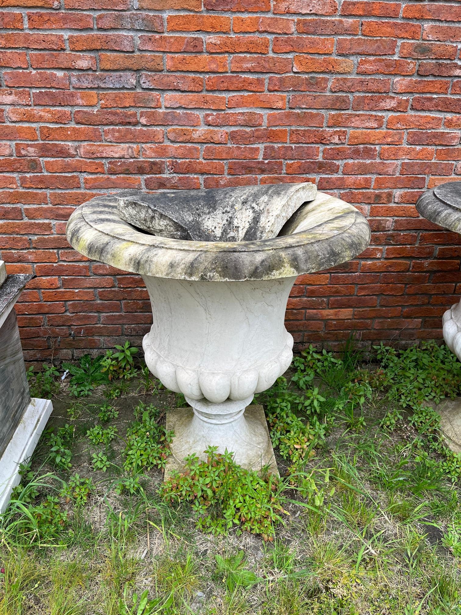 Par de copones en mármol blanco con friso lobulado. Alto 100 cm. Diámetro 88 cm. Averiados.