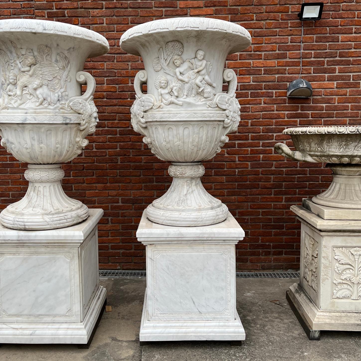 Par de copones en mármol blanco veteado estilo Luis XVI y tallados «niños con cisnes y carneros», con asas esculturadas «máscaras aladas». Presentados sobre pedestales cuadrados en mármol blanco veteado. Alto 222 cm. Diámetro de boca 105 cm.
