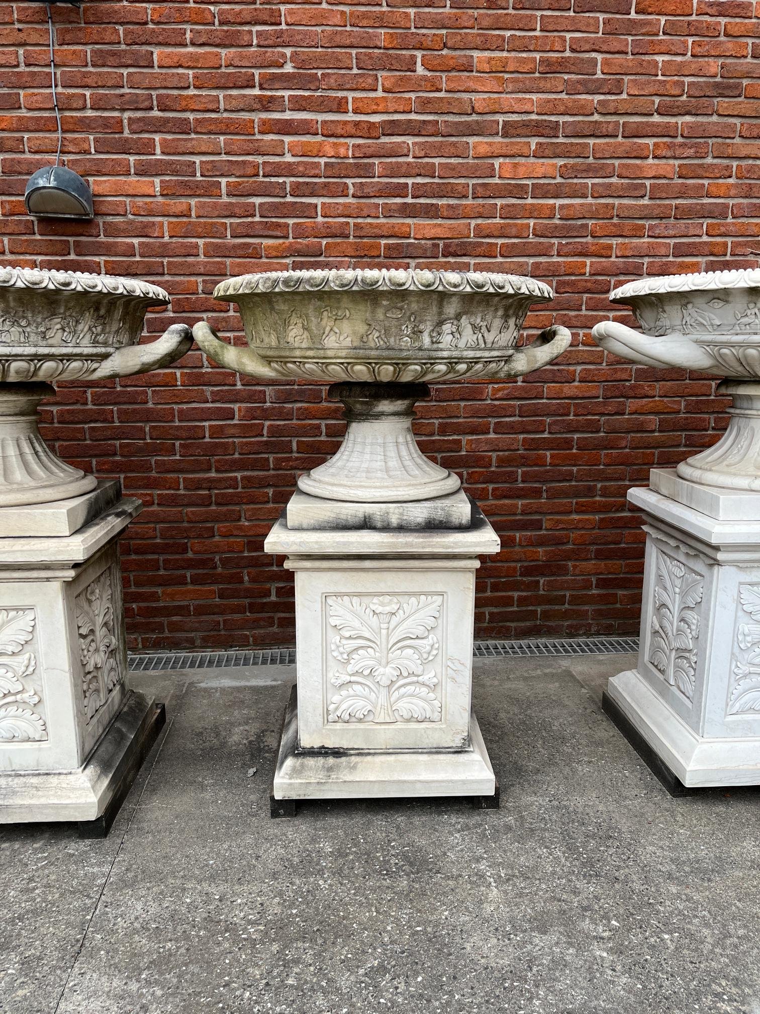 Par de copones en mármol con friso tallado «personajes griegos», guarda lobulada y borde perlado. Presentados sobre pedestales cuadrados tallados «hojas y flores». Alto total 150 cm. Diámetro 100 cm.