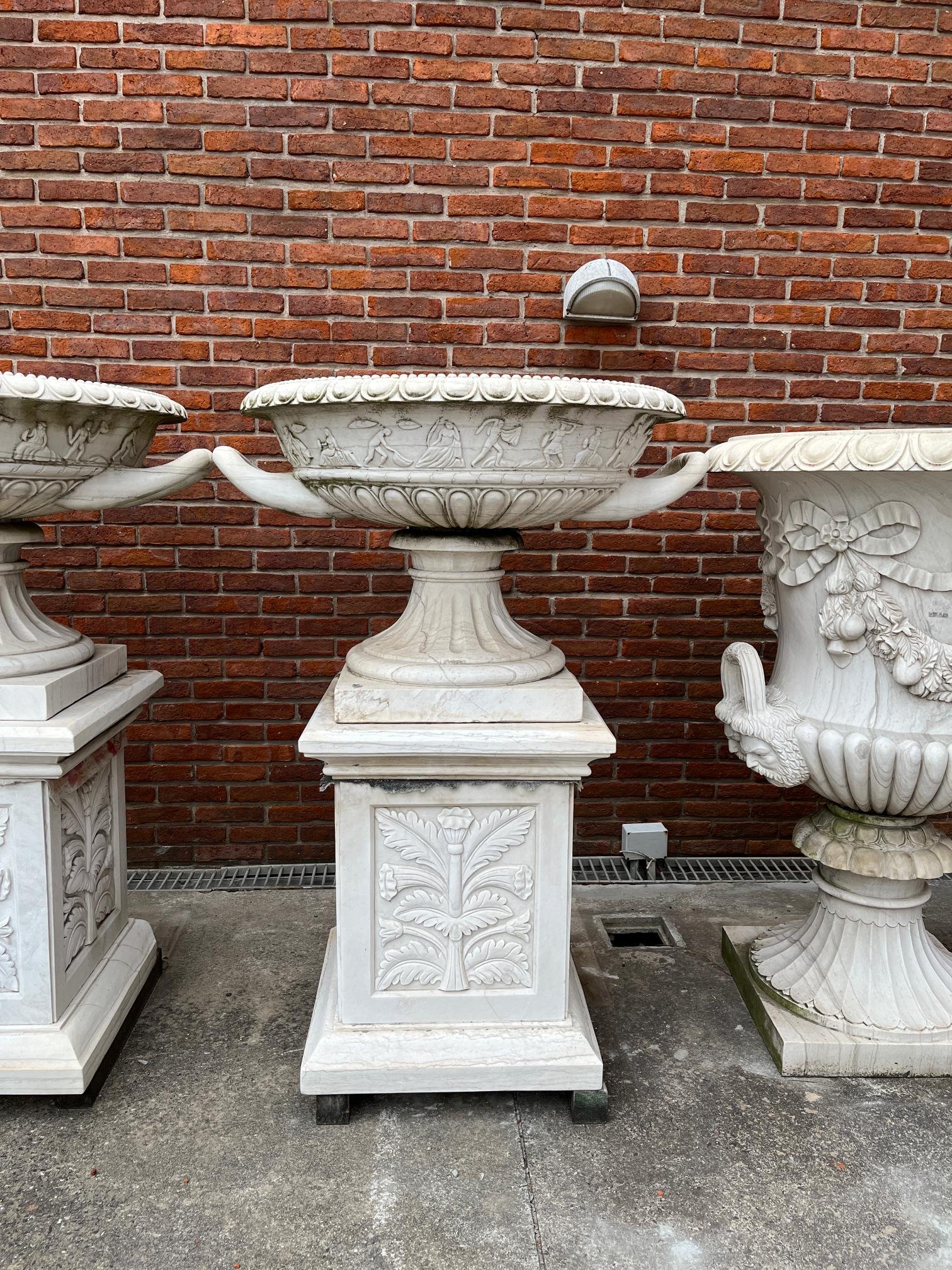 Par de copones en mármol con friso tallado «personajes griegos», guarda lobulada y borde perlado. Presentados sobre pedestales cuadrados tallados «hojas y flores». Alto total 150 cm. Diámetro 100 cm.