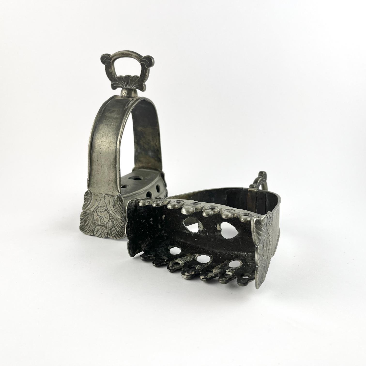 Par de estribos tipo zuncho en metal «Garantido» de Broqua & Scholberg, Montevideo, con laterales decorados «hojas y flores» y frentes calados. Alto 16 cm.