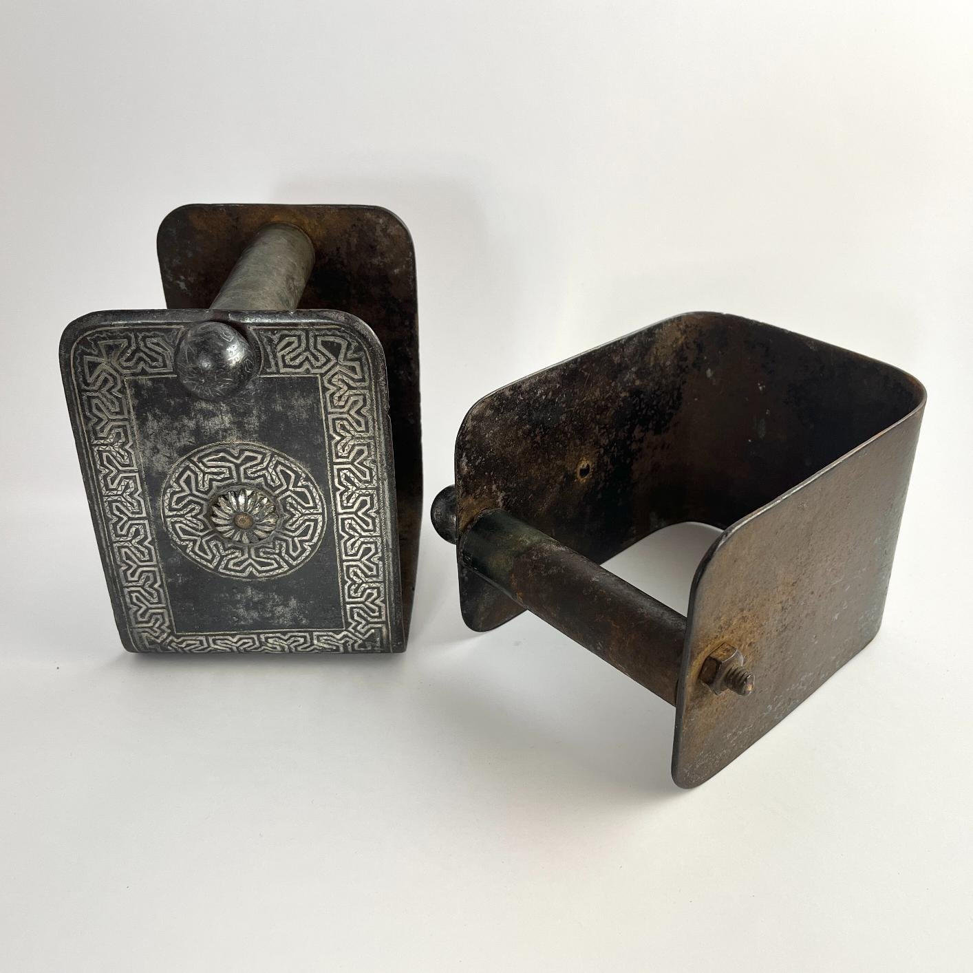 Par de estribos mexicanos s. XIX en hierro forjado, con laterales externos decorados «guardas geométricas» en incrustaciones de plata. Alto 15 cm. Proveniencia: colección Familia von Buch, Argentina.